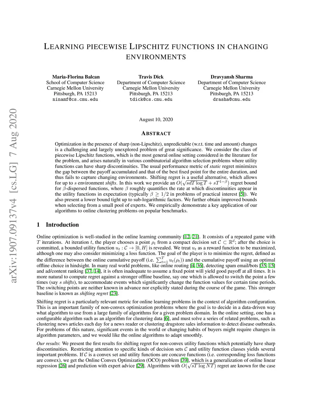 Optimization in the presence of sharp (non-Lipschitz), unpredictable (w.r.t. time and amount) changes is a challenging and largely unexplored problem of great significance. We consider the class of piecewise Lipschitz functions, which is the most general online setting considered in the literature for the problem, and arises naturally in various combinatorial algorithm selection problems where utility functions can have sharp discontinuities. The usual performance metric of regret minimizes the gap between the payoff accumulated and that of the best fixed point for the entire duration, and thus fails to capture changing environments. Shifting regret is a useful alternative, which allows for up to environment shifts. In this work we provide an regret bound for -dispersed functions, where roughly quantifies the rate at which discontinuities appear in the utility functions in expectation (typically in problems of practical interest). We also present a lower bound tight up to sub-logarithmic factors. We further obtain improved bounds when selecting from a small pool of experts. We empirically demonstrate a key application of our algorithms to online clustering problems on popular benchmarks.
