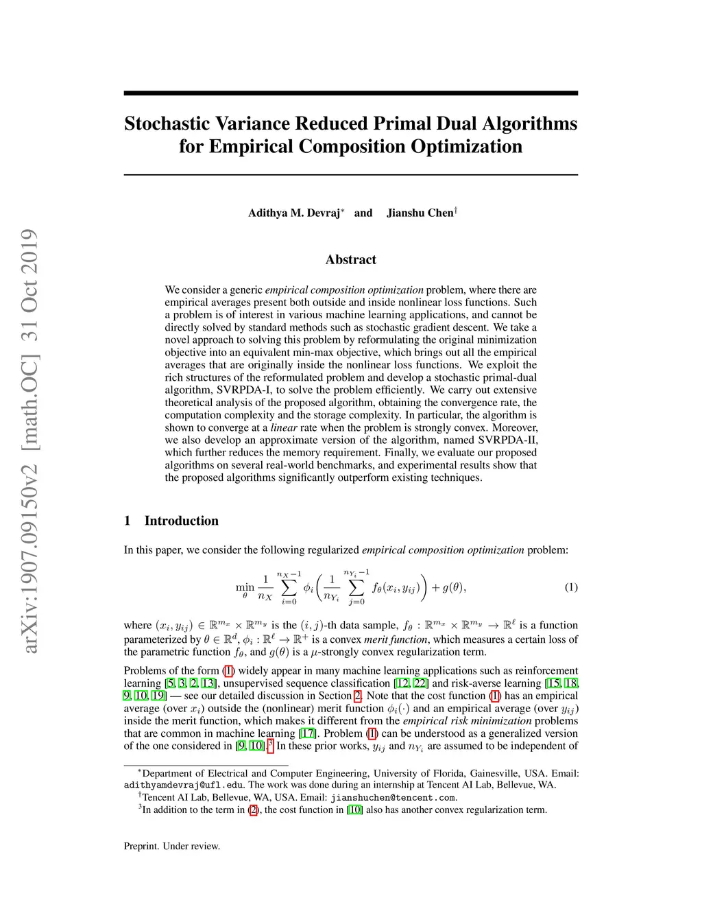 We consider a generic empirical composition optimization problem, where there are empirical averages present both outside and inside nonlinear loss functions. Such a problem is of interest in various machine learning applications, and cannot be directly solved by standard methods such as stochastic gradient descent. We take a novel approach to solving this problem by reformulating the original minimization objective into an equivalent min-max objective, which brings out all the empirical averages that are originally inside the nonlinear loss functions. We exploit the rich structures of the reformulated problem and develop a stochastic primal-dual algorithm, SVRPDA-I, to solve the problem efficiently. We carry out extensive theoretical analysis of the proposed algorithm, obtaining the convergence rate, the computation complexity and the storage complexity. In particular, the algorithm is shown to converge at a linear rate when the problem is strongly convex. Moreover, we also develop an approximate version of the algorithm, named SVRPDA-II, which further reduces the memory requirement. Finally, we evaluate our proposed algorithms on several real-world benchmarks, and experimental results show that the proposed algorithms significantly outperform existing techniques.
