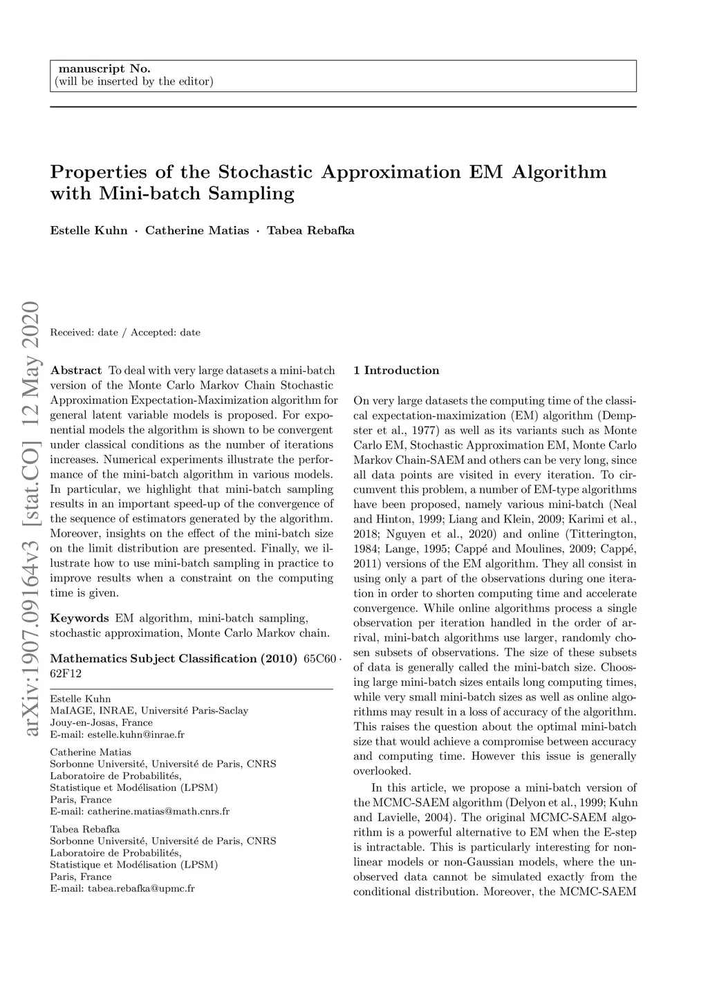 Properties of the Stochastic Approximation EM Algorithm with Mini-batch