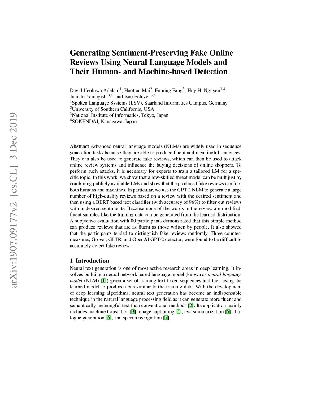 Advanced neural language models (NLMs) are widely used in sequence generation tasks because they are able to produce fluent and meaningful sentences. They can also be used to generate fake reviews, which can then be used to attack online review systems and influence the buying decisions of online shoppers. To perform such attacks, it is necessary for experts to train a tailored LM for a specific topic. In this work, we show that a low-skilled threat model can be built just by combining publicly available LMs and show that the produced fake reviews can fool both humans and machines. In particular, we use the GPT-2 NLM to generate a large number of high-quality reviews based on a review with the desired sentiment and then using a BERT based text classifier (with accuracy of 96%) to filter out reviews with undesired sentiments. Because none of the words in the review are modified, fluent samples like the training data can be generated from the learned distribution. A subjective evaluation with 80 participants demonstrated that this simple method can produce reviews that are as fluent as those written by people. It also showed that the participants tended to distinguish fake reviews randomly. Three countermeasures, Grover, GLTR, and OpenAI GPT-2 detector, were found to be difficult to accurately detect fake review.