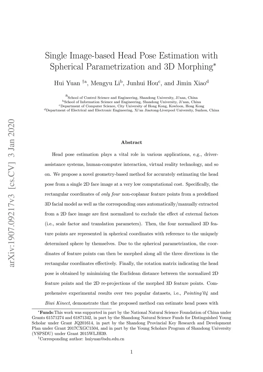 Head pose estimation plays a vital role in various applications, e.g., driverassistance systems, human-computer interaction, virtual reality technology, and so on. We propose a novel geometry based algorithm for accurately estimating the head pose from a single 2D face image at a very low computational cost. Specifically, the rectangular coordinates of only four non-coplanar feature points from a predefined 3D facial model as well as the corresponding ones automatically/ manually extracted from a 2D face image are first normalized to exclude the effect of external factors (i.e., scale factor and translation parameters). Then, the four normalized 3D feature points are represented in spherical coordinates with reference to the uniquely determined sphere by themselves. Due to the spherical parameterization, the coordinates of feature points can then be morphed along all the three directions in the rectangular coordinates effectively. Finally, the rotation matrix indicating the head pose is obtained by minimizing the Euclidean distance between the normalized 2D feature points and the 2D re-projections of morphed 3D feature points. Comprehensive experimental results over two popular databases, i.e., Pointing'04 and Biwi Kinect, demonstrate that the proposed algorithm can estimate head poses with higher accuracy and lower run time than state-of-the-art geometry based methods. Even compared with start-of-the-art learning based methods or geometry based methods with additional depth information, our algorithm still produces comparable performance.