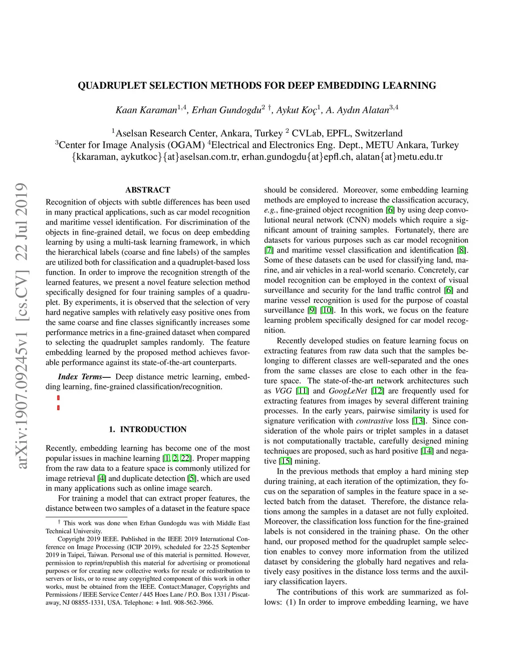 Recognition of objects with subtle differences has been used in many practical applications, such as car model recognition and maritime vessel identification. For discrimination of the objects in fine-grained detail, we focus on deep embedding learning by using a multi-task learning framework, in which the hierarchical labels (coarse and fine labels) of the samples are utilized both for classification and a quadruplet-based loss function. In order to improve the recognition strength of the learned features, we present a novel feature selection method specifically designed for four training samples of a quadruplet. By experiments, it is observed that the selection of very hard negative samples with relatively easy positive ones from the same coarse and fine classes significantly increases some performance metrics in a fine-grained dataset when compared to selecting the quadruplet samples randomly. The feature embedding learned by the proposed method achieves favorable performance against its state-of-the-art counterparts.