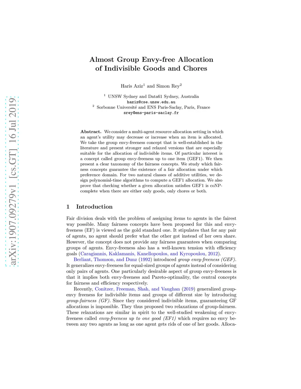 We consider a multi-agent resource allocation setting in which an agent's utility may decrease or increase when an item is allocated. We take the group envy-freeness concept that is well-established in the literature and present stronger and relaxed versions that are especially suitable for the allocation of indivisible items. Of particular interest is a concept called group envy-freeness up to one item (GEF1). We then present a clear taxonomy of the fairness concepts. We study which fairness concepts guarantee the existence of a fair allocation under which preference domain. For two natural classes of additive utilities, we design polynomial-time algorithms to compute a GEF1 allocation. We also prove that checking whether a given allocation satisfies GEF1 is coNP-complete when there are either only goods, only chores or both.