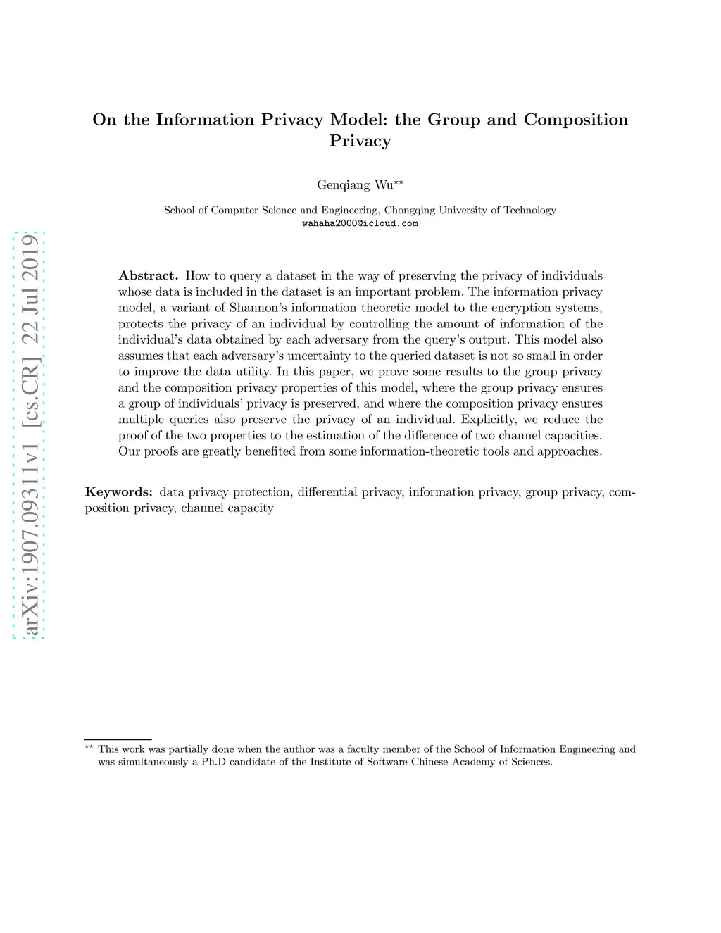 How to query a dataset in the way of preserving the privacy of individuals whose data is included in the dataset is an important problem. The information privacy model, a variant of Shannon's information theoretic model to the encryption systems, protects the privacy of an individual by controlling the amount of information of the individual's data obtained by each adversary from the query's output. This model also assumes that each adversary's uncertainty to the queried dataset is not so small in order to improve the data utility. In this paper, we prove some results to the group privacy and the composition privacy properties of this model, where the group privacy ensures a group of individuals' privacy is preserved, and where the composition privacy ensures multiple queries also preserve the privacy of an individual. Explicitly, we reduce the proof of the two properties to the estimation of the difference of two channel capacities. Our proofs are greatly benefited from some information-theoretic tools and approaches.