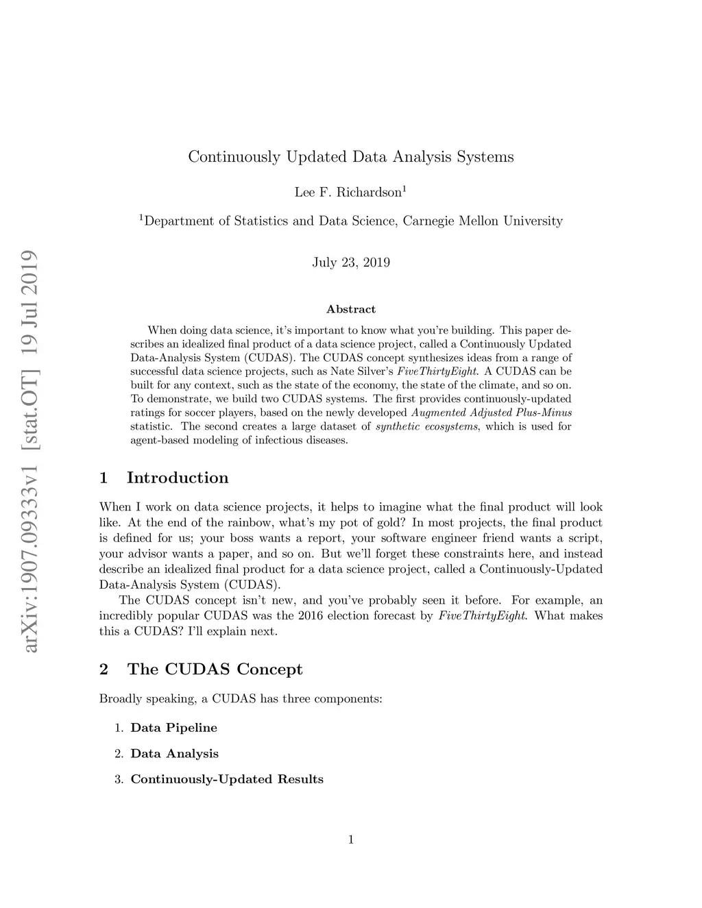 When doing data science, it's important to know what you're building. This paper describes an idealized final product of a data science project, called a Continuously Updated Data-Analysis System (CUDAS). The CUDAS concept synthesizes ideas from a range of successful data science projects, such as Nate Silver's FiveThirtyEight. A CUDAS can be built for any context, such as the state of the economy, the state of the climate, and so on. To demonstrate, we build two CUDAS systems. The first provides continuously-updated ratings for soccer players, based on the newly developed Augmented Adjusted Plus-Minus statistic. The second creates a large dataset of synthetic ecosystems, which is used for agent-based modeling of infectious diseases.