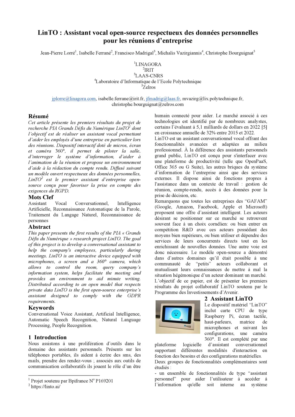 This paper presents the first results of the PIA "Grands D\éfis du Num\érique" research project LinTO. The goal of this project is to develop a conversational assistant to help the company's employees, particularly during meetings. LinTO is an interactive device equipped with microphones, a screen and a 360 camera, which allows to control the room, query company's information system, helps facilitate the meeting and provides an environment to aid minute writing. Distributed according to an open model that respects private data LinTO is the first open-source enterprise's assistant designed to comply with the GDPR requirements.