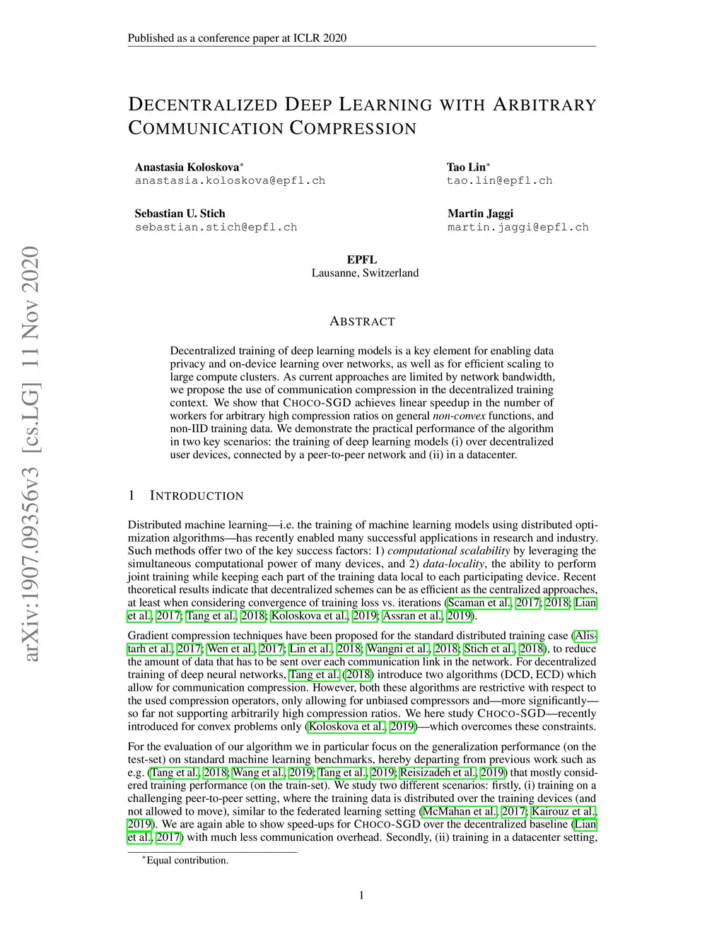 Decentralized training of deep learning models is a key element for enabling data privacy and on-device learning over networks, as well as for efficient scaling to large compute clusters. As current approaches suffer from limited bandwidth of the network, we propose the use of communication compression in the decentralized training context. We show that Choco-SGD recently introduced and analyzed for strongly-convex objectives only converges under arbitrary high compression ratio on general non-convex functions at the rate where denotes the number of iterations and the number of workers. The algorithm achieves linear speedup in the number of workers and supports higher compression than previous state-of-the art methods. We demonstrate the practical performance of the algorithm in two key scenarios: the training of deep learning models (i) over distributed user devices, connected by a social network and (ii) in a datacenter (outperforming all-reduce time-wise).