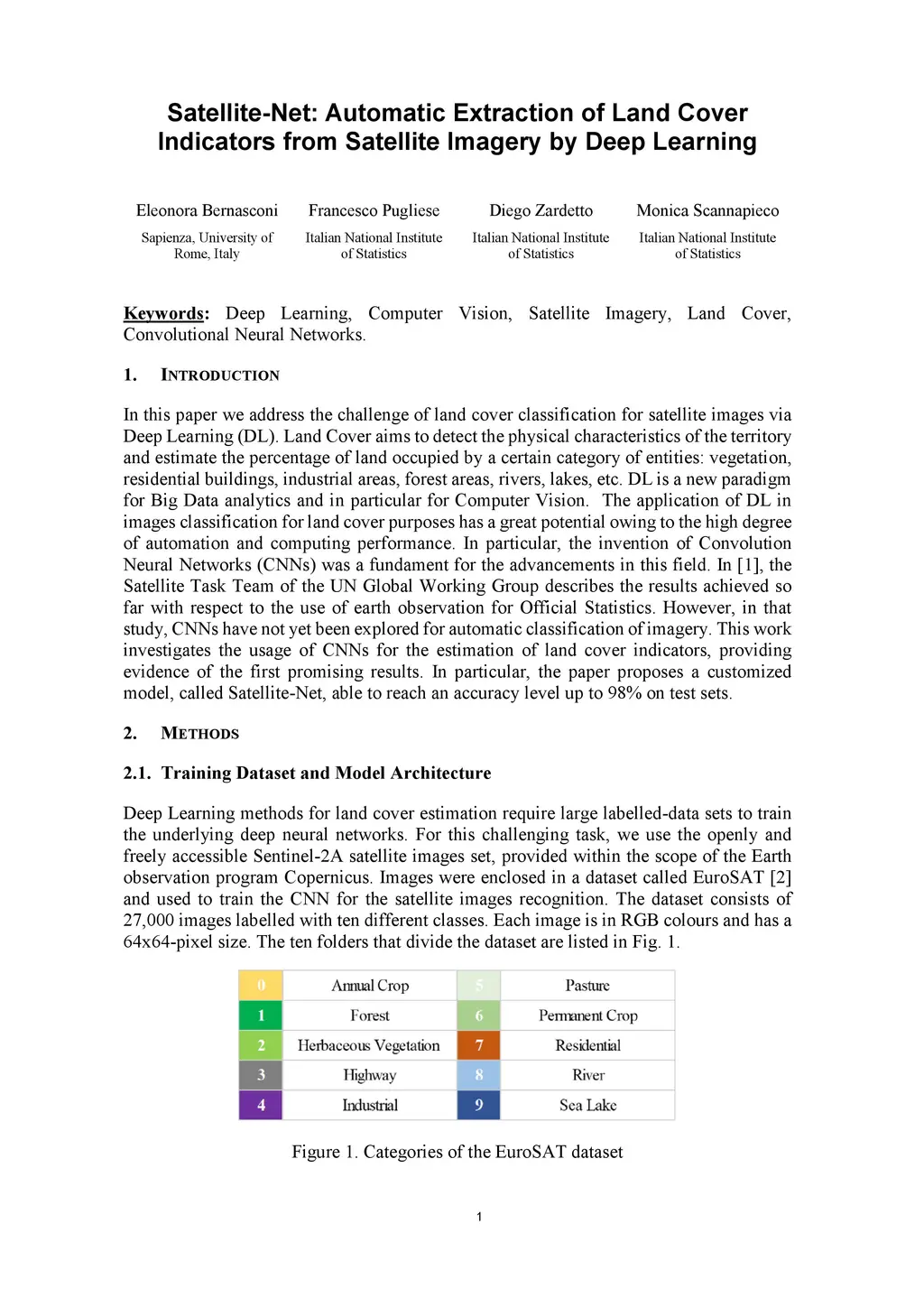 In this paper we address the challenge of land cover classification for satellite images via Deep Learning (DL). Land Cover aims to detect the physical characteristics of the territory and estimate the percentage of land occupied by a certain category of entities: vegetation, residential buildings, industrial areas, forest areas, rivers, lakes, etc. DL is a new paradigm for Big Data analytics and in particular for Computer Vision. The application of DL in images classification for land cover purposes has a great potential owing to the high degree of automation and computing performance. In particular, the invention of Convolution Neural Networks (CNNs) was a fundament for the advancements in this field. In [1], the Satellite Task Team of the UN Global Working Group describes the results achieved so far with respect to the use of earth observation for Official Statistics. However, in that study, CNNs have not yet been explored for automatic classification of imagery. This work investigates the usage of CNNs for the estimation of land cover indicators, providing evidence of the first promising results. In particular, the paper proposes a customized model, called Satellite-Net, able to reach an accuracy level up to 98% on test sets.