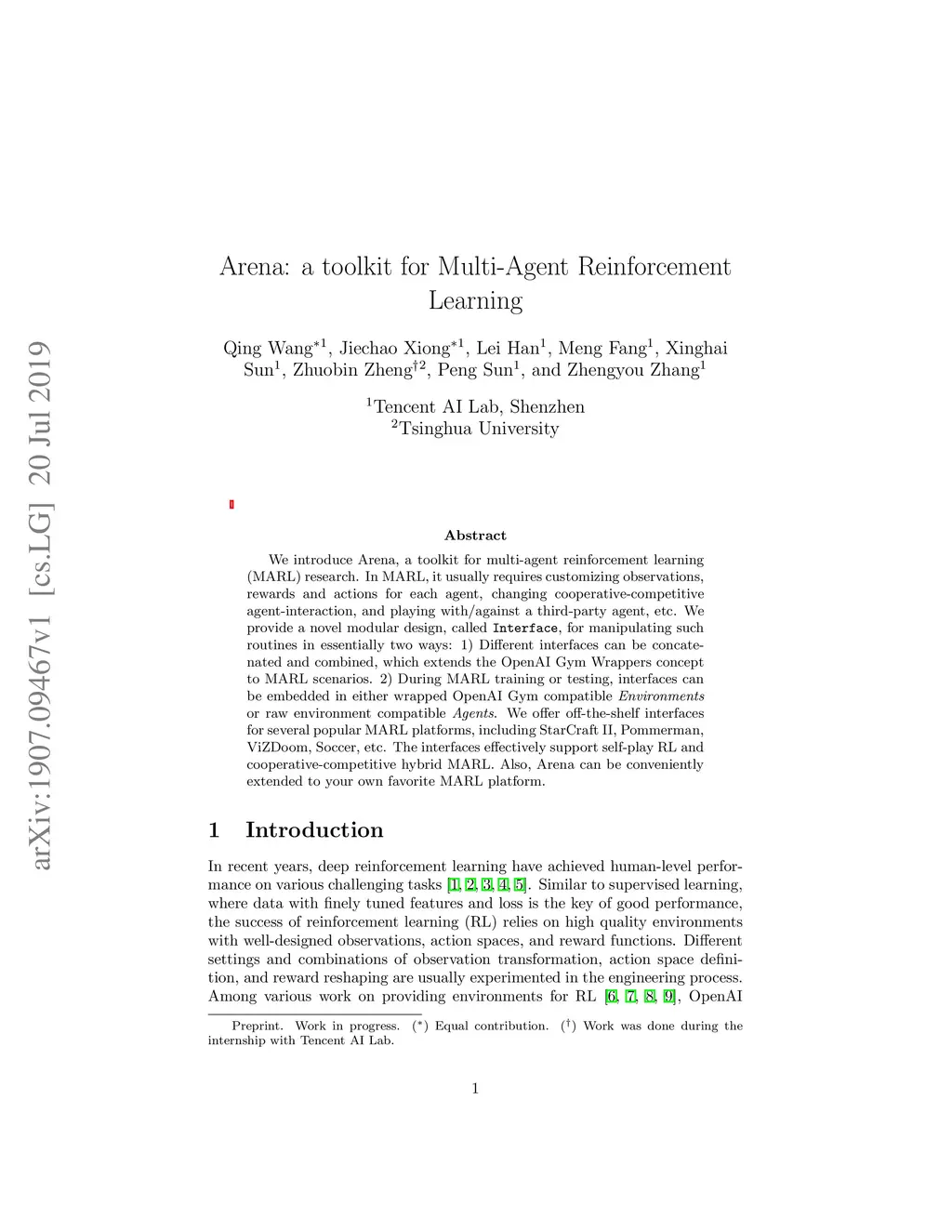 We introduce Arena, a toolkit for multi-agent reinforcement learning (MARL) research. In MARL, it usually requires customizing observations, rewards and actions for each agent, changing cooperative-competitive agent-interaction, and playing with/against a third-party agent, etc. We provide a novel modular design, called Interface, for manipulating such routines in essentially two ways: 1) Different interfaces can be concatenated and combined, which extends the OpenAI Gym Wrappers concept to MARL scenarios. 2) During MARL training or testing, interfaces can be embedded in either wrapped OpenAI Gym compatible Environments or raw environment compatible Agents. We offer off-the-shelf interfaces for several popular MARL platforms, including StarCraft II, Pommerman, ViZDoom, Soccer, etc. The interfaces effectively support self-play RL and cooperative-competitive hybrid MARL. Also, Arena can be conveniently extended to your own favorite MARL platform.