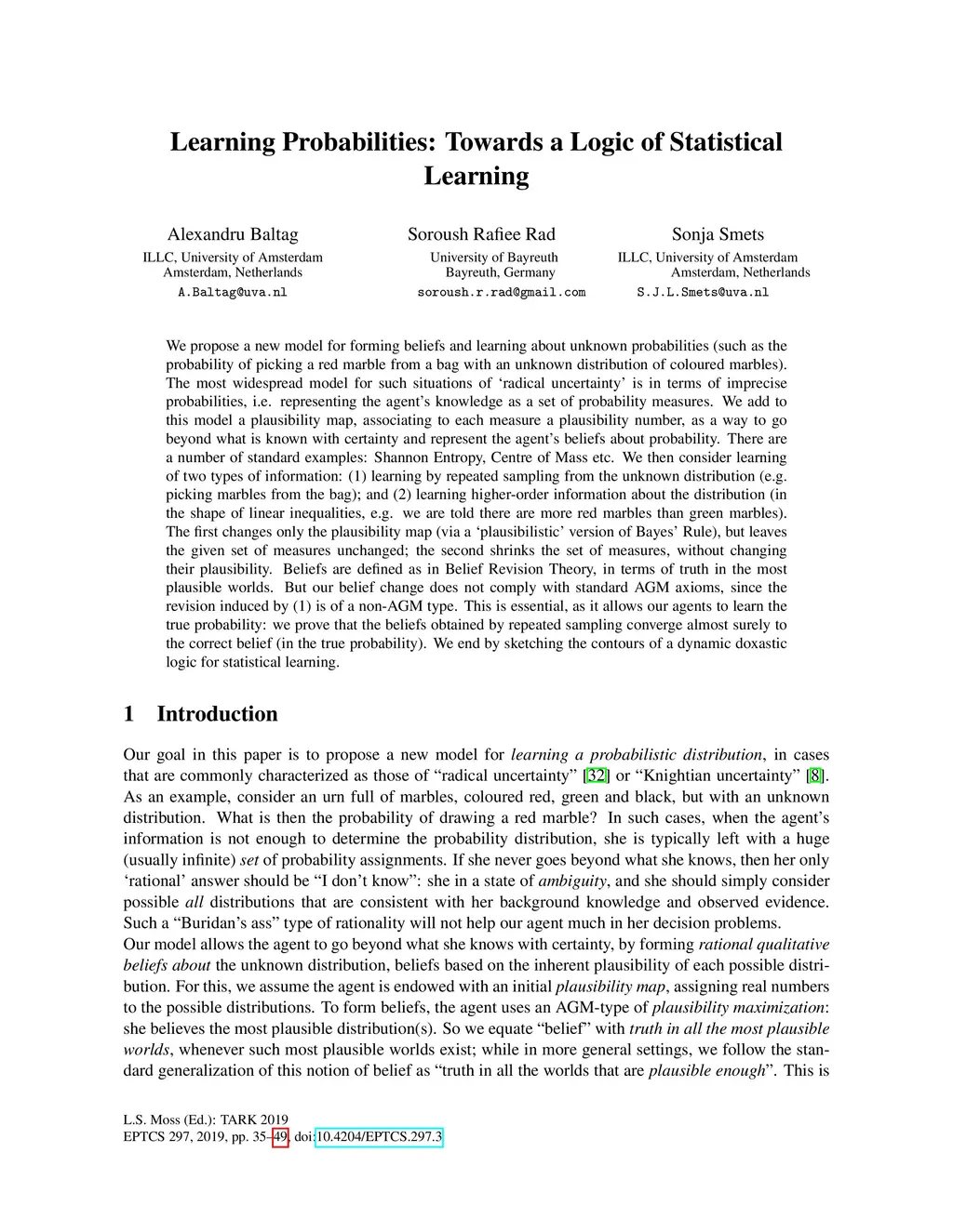 We propose a new model for forming beliefs and learning about unknown probabilities (such as the probability of picking a red marble from a bag with an unknown distribution of coloured marbles). The most widespread model for such situations of 'radical uncertainty' is in terms of imprecise probabilities, i.e. representing the agent's knowledge as a set of probability measures. We add to this model a plausibility map, associating to each measure a plausibility number, as a way to go beyond what is known with certainty and represent the agent's beliefs about probability. There are a number of standard examples: Shannon Entropy, Centre of Mass etc. We then consider learning of two types of information: (1) learning by repeated sampling from the unknown distribution (e.g. picking marbles from the bag); and (2) learning higher-order information about the distribution (in the shape of linear inequalities, e.g. we are told there are more red marbles than green marbles). The first changes only the plausibility map (via a 'plausibilistic' version of Bayes' Rule), but leaves the given set of measures unchanged; the second shrinks the set of measures, without changing their plausibility. Beliefs are defined as in Belief Revision Theory, in terms of truth in the most plausible worlds. But our belief change does not comply with standard AGM axioms, since the revision induced by (1) is of a non-AGM type. This is essential, as it allows our agents to learn the true probability: we prove that the beliefs obtained by repeated sampling converge almost surely to the correct belief (in the true probability). We end by sketching the contours of a dynamic doxastic logic for statistical learning.