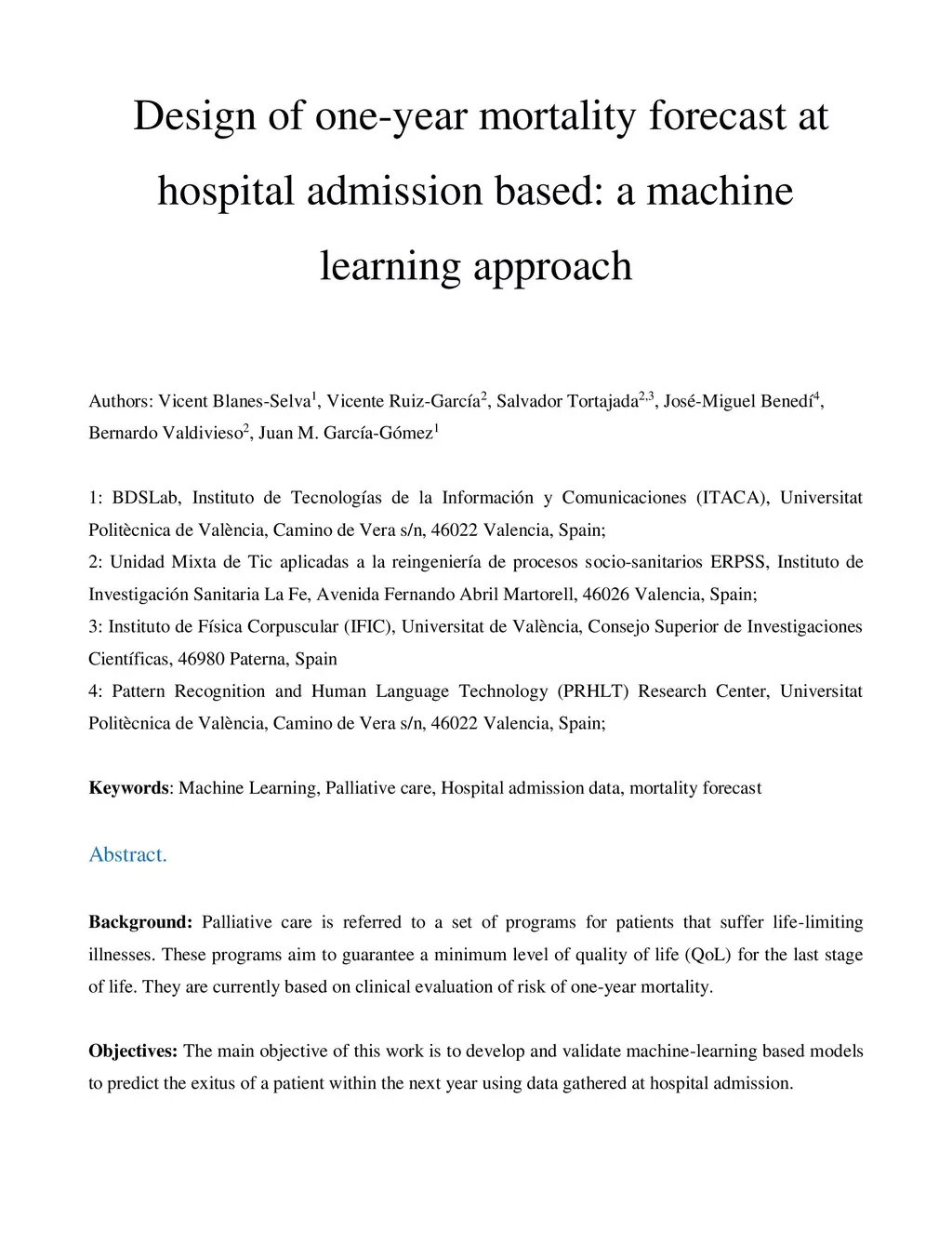 Background: Palliative care is referred to a set of programs for patients that suffer life-limiting illnesses. These programs aim to guarantee a minimum level of quality of life (QoL) for the last stage of life. They are currently based on clinical evaluation of risk of one-year mortality. Objectives: The main objective of this work is to develop and validate machine-learning based models to predict the exitus of a patient within the next year using data gathered at hospital admission. Methods: Five machine learning techniques were applied in our study to develop machine-learning predictive models: Support Vector Machines, K-neighbors Classifier, Gradient Boosting Classifier, Random Forest and Multilayer Perceptron. All models were trained and evaluated using the retrospective dataset. The evaluation was performed with five metrics computed by a resampling strategy: Accuracy, the area under the ROC curve, Specificity, Sensitivity, and the Balanced Error Rate. Results: All models for forecasting one-year mortality achieved an AUC ROC from 0.858 to 0.911. Specifically, Gradient Boosting Classifier was the best model, producing an AUC ROC of 0.911 (CI 95%, 0.911 to 0.912), a sensitivity of 0.858 (CI 95%, 0.856 to 0.86) and a specificity of 0.807 (CI 95%, 0.806 to 0808) and a BER of 0.168 (CI 95%, 0.167 to 0.169). Conclusions: The analysis of common information at hospital admission combined with machine learning techniques produced models with competitive discriminative power. Our models reach the best results reported in state of the art. These results demonstrate that they can be used as an accurate data-driven palliative care criteria inclusion.