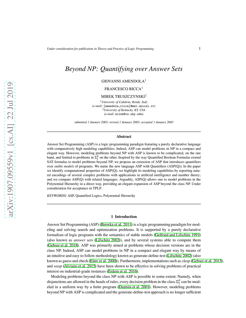Answer Set Programming (ASP) is a logic programming paradigm featuring a purely declarative language with comparatively high modeling capabilities. Indeed, ASP can model problems in NP in a compact and elegant way. However, modeling problems beyond NP with ASP is known to be complicated, on the one hand, and limited to problems in {\Sigma}^P_2 on the other. Inspired by the way Quantified Boolean Formulas extend SAT formulas to model problems beyond NP, we propose an extension of ASP that introduces quantifiers over stable models of programs. We name the new language ASP with Quantifiers (ASP(Q)). In the paper we identify computational properties of ASP(Q); we highlight its modeling capabilities by reporting natural encodings of several complex problems with applications in artificial intelligence and number theory; and we compare ASP(Q) with related languages. Arguably, ASP(Q) allows one to model problems in the Polynomial Hierarchy in a direct way, providing an elegant expansion of ASP beyond the class NP. Under consideration for acceptance in TPLP.