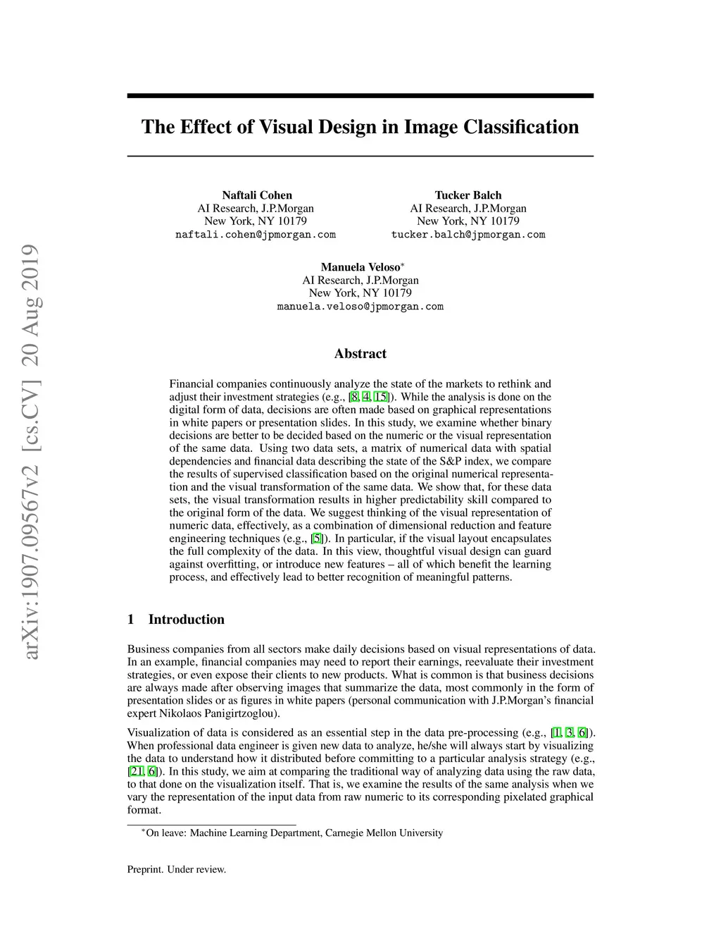 Financial companies continuously analyze the state of the markets to rethink and adjust their investment strategies. While the analysis is done on the digital form of data, decisions are often made based on graphical representations in white papers or presentation slides. In this study, we examine whether binary decisions are better to be decided based on the numeric or the visual representation of the same data. Using two data sets, a matrix of numerical data with spatial dependencies and financial data describing the state of the S&P index, we compare the results of supervised classification based on the original numerical representation and the visual transformation of the same data. We show that, for these data sets, the visual transformation results in higher predictability skill compared to the original form of the data. We suggest thinking of the visual representation of numeric data, effectively, as a combination of dimensional reduction and feature engineering techniques. In particular, if the visual layout encapsulates the full complexity of the data. In this view, thoughtful visual design can guard against overfitting, or introduce new features -- all of which benefit the learning process, and effectively lead to better recognition of meaningful patterns.