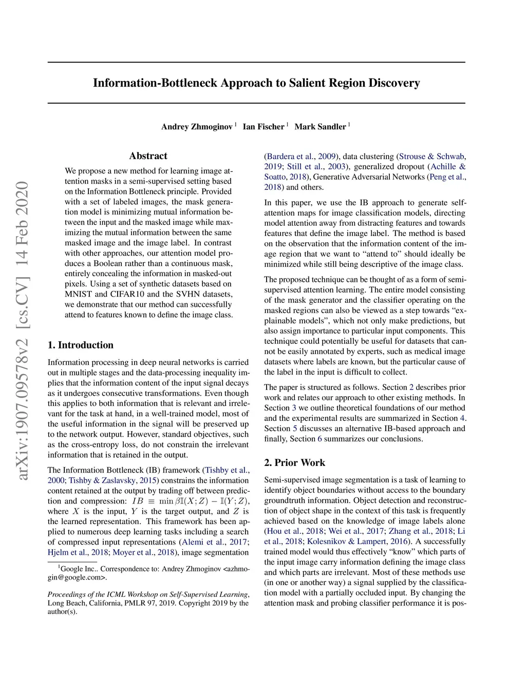 We propose a new method for learning image attention masks in a semi-supervised setting based on the Information Bottleneck principle. Provided with a set of labeled images, the mask generation model is minimizing mutual information between the input and the masked image while maximizing the mutual information between the same masked image and the image label. In contrast with other approaches, our attention model produces a Boolean rather than a continuous mask, entirely concealing the information in masked-out pixels. Using a set of synthetic datasets based on MNIST and CIFAR10 and the SVHN datasets, we demonstrate that our method can successfully attend to features known to define the image class.