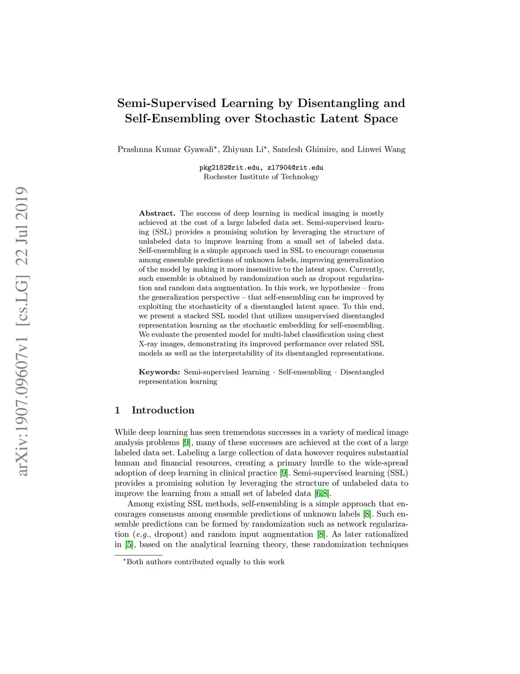 The success of deep learning in medical imaging is mostly achieved at the cost of a large labeled data set. Semi-supervised learning (SSL) provides a promising solution by leveraging the structure of unlabeled data to improve learning from a small set of labeled data. Self-ensembling is a simple approach used in SSL to encourage consensus among ensemble predictions of unknown labels, improving generalization of the model by making it more insensitive to the latent space. Currently, such an ensemble is obtained by randomization such as dropout regularization and random data augmentation. In this work, we hypothesize -- from the generalization perspective -- that self-ensembling can be improved by exploiting the stochasticity of a disentangled latent space. To this end, we present a stacked SSL model that utilizes unsupervised disentangled representation learning as the stochastic embedding for self-ensembling. We evaluate the presented model for multi-label classification using chest X-ray images, demonstrating its improved performance over related SSL models as well as the interpretability of its disentangled representations.
