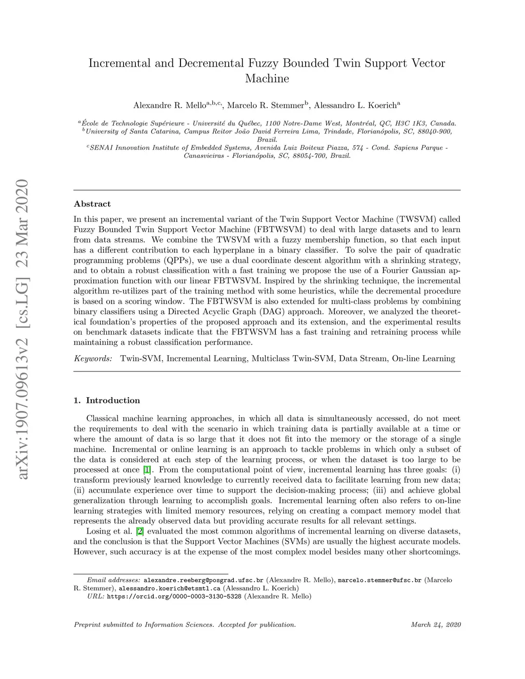 In this paper we present an incremental variant of the Twin Support Vector Machine (TWSVM) called Fuzzy Bounded Twin Support Vector Machine (FBTWSVM) to deal with large datasets and learning from data streams. We combine the TWSVM with a fuzzy membership function, so that each input has a different contribution to each hyperplane in a binary classifier. To solve the pair of quadratic programming problems (QPPs) we use a dual coordinate descent algorithm with a shrinking strategy, and to obtain a robust classification with a fast training we propose the use of a Fourier Gaussian approximation function with our linear FBTWSVM. Inspired by the shrinking technique, the incremental algorithm re-utilizes part of the training method with some heuristics, while the decremental procedure is based on a scored window. The FBTWSVM is also extended for multi-class problems by combining binary classifiers using a Directed Acyclic Graph (DAG) approach. Moreover, we analyzed the theoretical foundations properties of the proposed approach and its extension, and the experimental results on benchmark datasets indicate that the FBTWSVM has a fast training and retraining process while maintaining a robust classification performance.