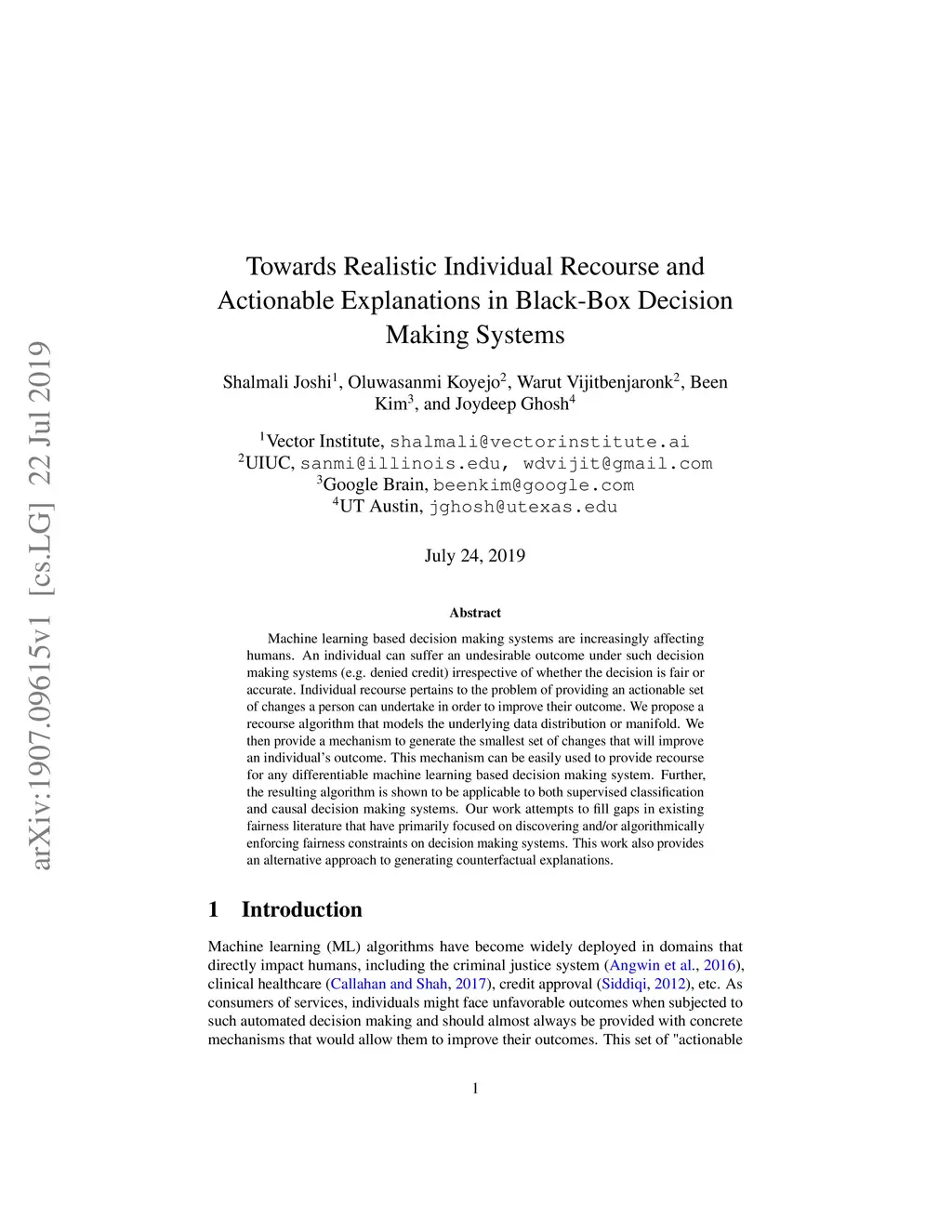 Machine learning based decision making systems are increasingly affecting humans. An individual can suffer an undesirable outcome under such decision making systems (e.g. denied credit) irrespective of whether the decision is fair or accurate. Individual recourse pertains to the problem of providing an actionable set of changes a person can undertake in order to improve their outcome. We propose a recourse algorithm that models the underlying data distribution or manifold. We then provide a mechanism to generate the smallest set of changes that will improve an individual's outcome. This mechanism can be easily used to provide recourse for any differentiable machine learning based decision making system. Further, the resulting algorithm is shown to be applicable to both supervised classification and causal decision making systems. Our work attempts to fill gaps in existing fairness literature that have primarily focused on discovering and/or algorithmically enforcing fairness constraints on decision making systems. This work also provides an alternative approach to generating counterfactual explanations.