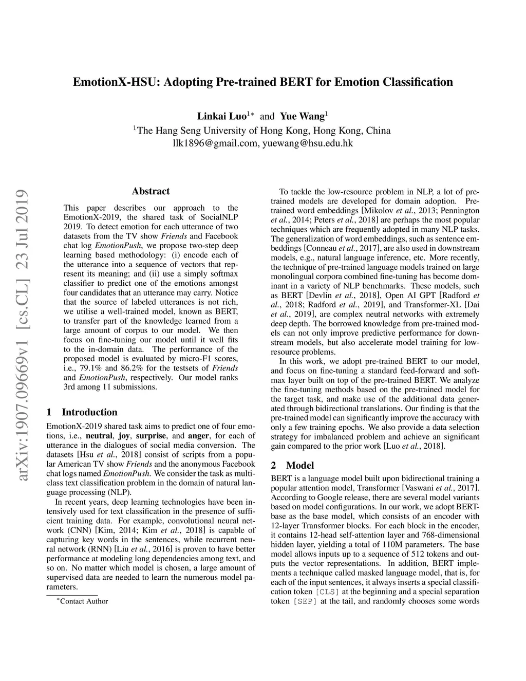 This paper describes our approach to the EmotionX-2019, the shared task of SocialNLP 2019. To detect emotion for each utterance of two datasets from the TV show Friends and Facebook chat log EmotionPush, we propose two-step deep learning based methodology: (i) encode each of the utterance into a sequence of vectors that represent its meaning; and (ii) use a simply softmax classifier to predict one of the emotions amongst four candidates that an utterance may carry. Notice that the source of labeled utterances is not rich, we utilise a well-trained model, known as BERT, to transfer part of the knowledge learned from a large amount of corpus to our model. We then focus on fine-tuning our model until it well fits to the in-domain data. The performance of the proposed model is evaluated by micro-F1 scores, i.e., 79.1% and 86.2% for the testsets of Friends and EmotionPush, respectively. Our model ranks 3rd among 11 submissions.
