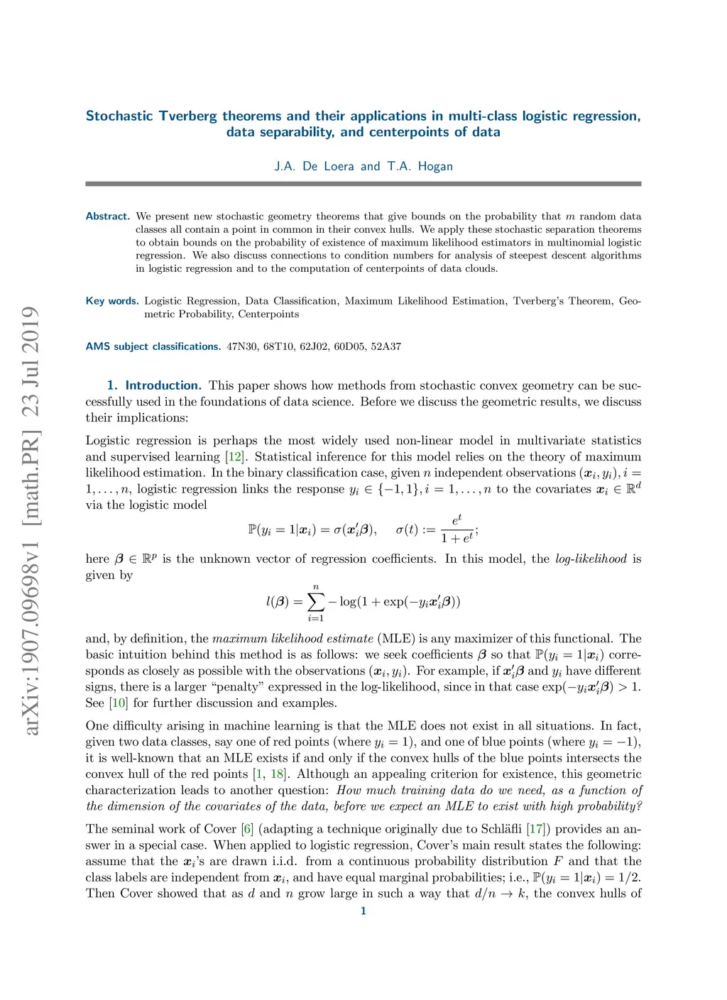 We present new stochastic geometry theorems that give bounds on the probability that random data classes all contain a point in common in their convex hulls. We apply these stochastic separation theorems to obtain bounds on the probability of existence of maximum likelihood estimators in multinomial logistic regression. We also discuss connections to condition numbers for analysis of steepest descent algorithms in logistic regression and to the computation of centerpoints of data clouds.
