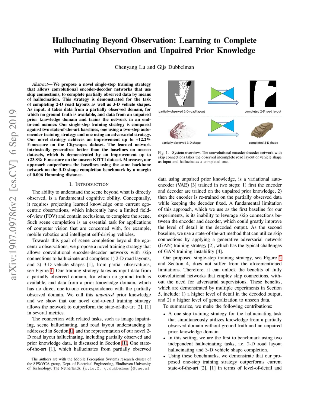 We propose a novel single-step training strategy that allows convolutional encoder-decoder networks that use skip connections, to complete partially observed data by means of hallucination. This strategy is demonstrated for the task of completing 2-D road layouts as well as 3-D vehicle shapes. As input, it takes data from a partially observed domain, for which no ground truth is available, and data from an unpaired prior knowledge domain and trains the network in an end-to-end manner. Our single-step training strategy is compared against two state-of-the-art baselines, one using a two-step auto-encoder training strategy and one using an adversarial strategy. Our novel strategy achieves an improvement up to +12.2% F-measure on the Cityscapes dataset. The learned network intrinsically generalizes better than the baselines on unseen datasets, which is demonstrated by an improvement up to +23.8% F-measure on the unseen KITTI dataset. Moreover, our approach outperforms the baselines using the same backbone network on the 3-D shape completion benchmark by a margin of 0.006 Hamming distance.