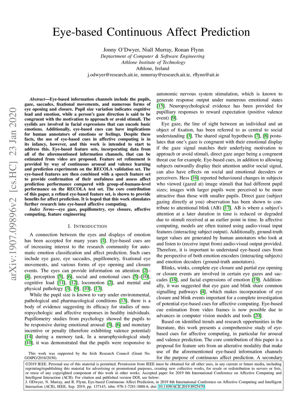 Eye-based Continuous Affect Prediction