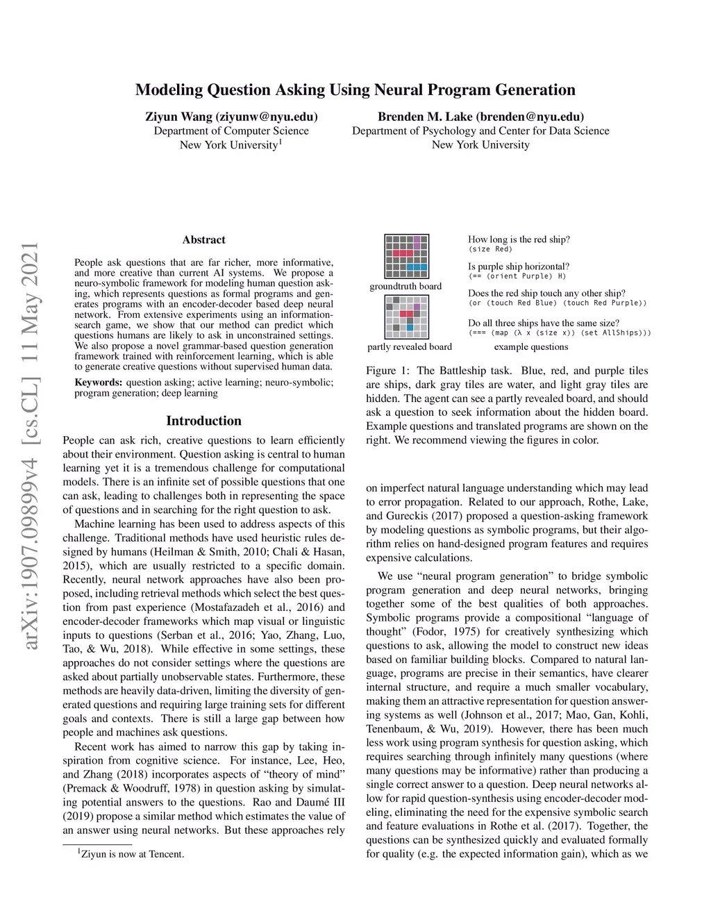 People ask questions that are far richer, more informative, and more creative than current AI systems. We propose a neuro-symbolic framework for modeling human question asking, which represents questions as formal programs and generates programs with an encoder-decoder based deep neural network. From extensive experiments using an information-search game, we show that our method can predict which questions humans are likely to ask in unconstrained settings. We also propose a novel grammar-based question generation framework trained with reinforcement learning, which is able to generate creative questions without supervised human data.
