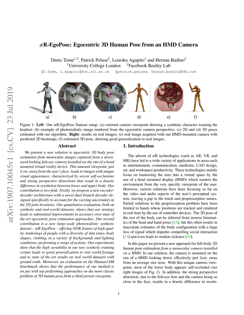 We present a new solution to egocentric 3D body pose estimation from monocular images captured from a downward looking fish-eye camera installed on the rim of a head mounted virtual reality device. This unusual viewpoint, just 2 cm. away from the user's face, leads to images with unique visual appearance, characterized by severe self-occlusions and strong perspective distortions that result in a drastic difference in resolution between lower and upper body. Our contribution is two-fold. Firstly, we propose a new encoder-decoder architecture with a novel dual branch decoder designed specifically to account for the varying uncertainty in the 2D joint locations. Our quantitative evaluation, both on synthetic and real-world datasets, shows that our strategy leads to substantial improvements in accuracy over state of the art egocentric pose estimation approaches. Our second contribution is a new large-scale photorealistic synthetic dataset - xR-EgoPose - offering 383K frames of high quality renderings of people with a diversity of skin tones, body shapes, clothing, in a variety of backgrounds and lighting conditions, performing a range of actions. Our experiments show that the high variability in our new synthetic training corpus leads to good generalization to real world footage and to state of the art results on real world datasets with ground truth. Moreover, an evaluation on the Human3.6M benchmark shows that the performance of our method is on par with top performing approaches on the more classic problem of 3D human pose from a third person viewpoint.