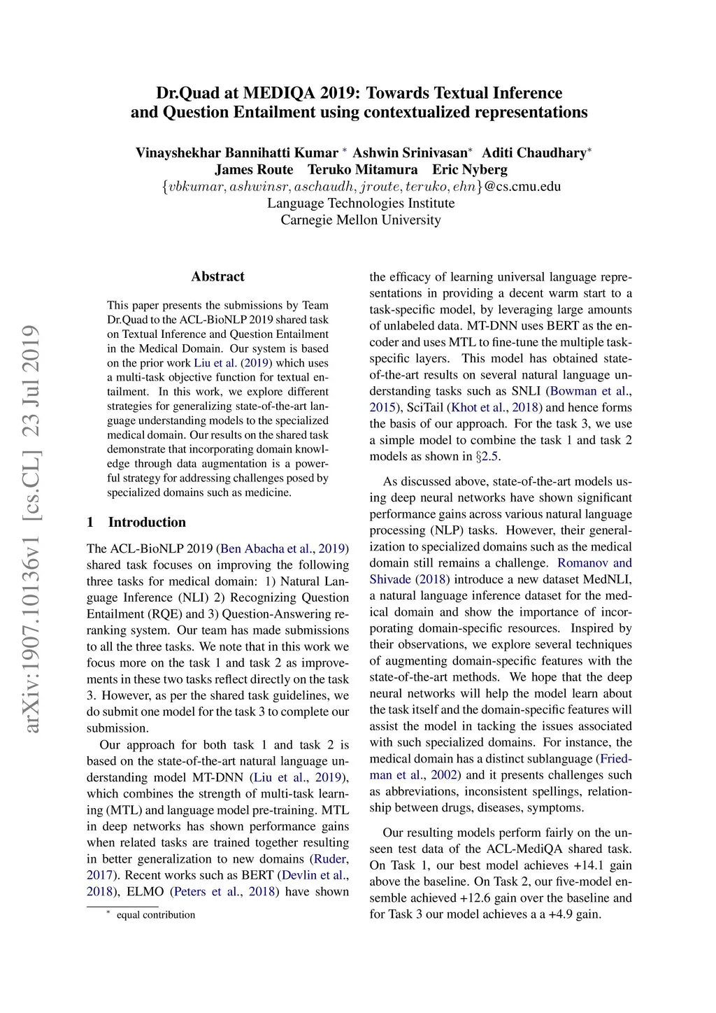 This paper presents the submissions by Team Dr.Quad to the ACL-BioNLP 2019 shared task on Textual Inference and Question Entailment in the Medical Domain. Our system is based on the prior work Liu et al. (2019) which uses a multi-task objective function for textual entailment. In this work, we explore different strategies for generalizing state-of-the-art language understanding models to the specialized medical domain. Our results on the shared task demonstrate that incorporating domain knowledge through data augmentation is a powerful strategy for addressing challenges posed by specialized domains such as medicine.