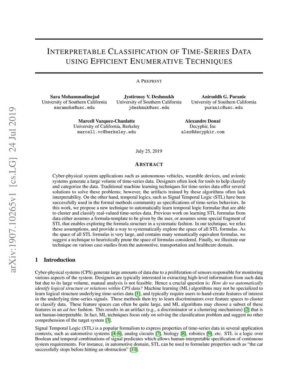 Cyber-physical system applications such as autonomous vehicles, wearable devices, and avionic systems generate a large volume of time-series data. Designers often look for tools to help classify and categorize the data. Traditional machine learning techniques for time-series data offer several solutions to solve these problems; however, the artifacts trained by these algorithms often lack interpretability. On the other hand, temporal logics, such as Signal Temporal Logic (STL) have been successfully used in the formal methods community as specifications of time-series behaviors. In this work, we propose a new technique to automatically learn temporal logic formulae that are able to cluster and classify real-valued time-series data. Previous work on learning STL formulas from data either assumes a formula-template to be given by the user, or assumes some special fragment of STL that enables exploring the formula structure in a systematic fashion. In our technique, we relax these assumptions, and provide a way to systematically explore the space of all STL formulas. As the space of all STL formulas is very large, and contains many semantically equivalent formulas, we suggest a technique to heuristically prune the space of formulas considered. Finally, we illustrate our technique on various case studies from the automotive, transportation and healthcare domain.