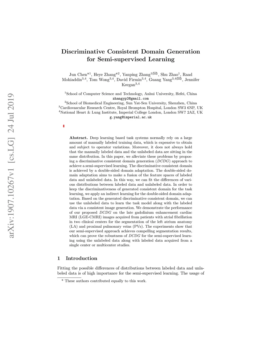 Deep learning based task systems normally rely on a large amount of manually labeled training data, which is expensive to obtain and subject to operator variations. Moreover, it does not always hold that the manually labeled data and the unlabeled data are sitting in the same distribution. In this paper, we alleviate these problems by proposing a discriminative consistent domain generation (DCDG) approach to achieve a semi-supervised learning. The discriminative consistent domain is achieved by a double-sided domain adaptation. The double-sided domain adaptation aims to make a fusion of the feature spaces of labeled data and unlabeled data. In this way, we can fit the differences of various distributions between labeled data and unlabeled data. In order to keep the discriminativeness of generated consistent domain for the task learning, we apply an indirect learning for the double-sided domain adaptation. Based on the generated discriminative consistent domain, we can use the unlabeled data to learn the task model along with the labeled data via a consistent image generation. We demonstrate the performance of our proposed DCDG on the late gadolinium enhancement cardiac MRI (LGE-CMRI) images acquired from patients with atrial fibrillation in two clinical centers for the segmentation of the left atrium anatomy (LA) and proximal pulmonary veins (PVs). The experiments show that our semi-supervised approach achieves compelling segmentation results, which can prove the robustness of DCDG for the semi-supervised learning using the unlabeled data along with labeled data acquired from a single center or multicenter studies.
