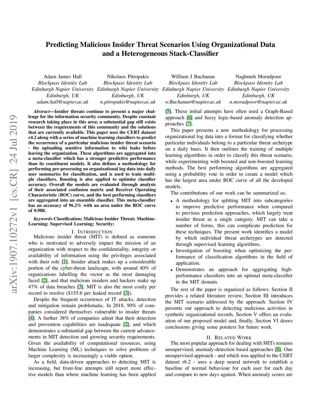 Insider threats continue to present a major challenge for the information security community. Despite constant research taking place in this area; a substantial gap still exists between the requirements of this community and the solutions that are currently available. This paper uses the CERT dataset r4.2 along with a series of machine learning classifiers to predict the occurrence of a particular malicious insider threat scenario - the uploading sensitive information to wiki leaks before leaving the organization. These algorithms are aggregated into a meta-classifier which has a stronger predictive performance than its constituent models. It also defines a methodology for performing pre-processing on organizational log data into daily user summaries for classification, and is used to train multiple classifiers. Boosting is also applied to optimise classifier accuracy. Overall the models are evaluated through analysis of their associated confusion matrix and Receiver Operating Characteristic (ROC) curve, and the best performing classifiers are aggregated into an ensemble classifier. This meta-classifier has an accuracy of \textbf{96.2\%} with an area under the ROC curve of \textbf{0.988}.