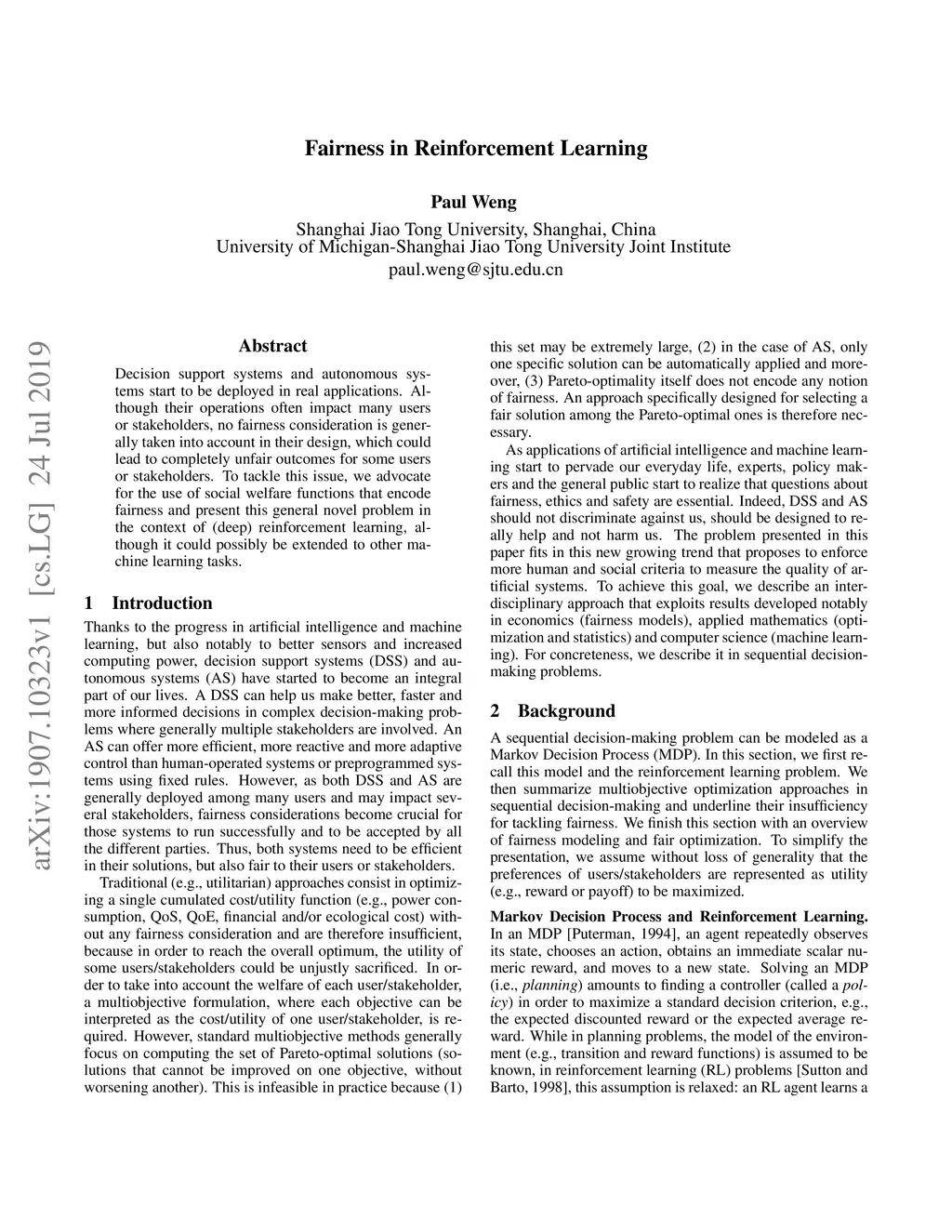 Decision support systems (e.g., for ecological conservation) and autonomous systems (e.g., adaptive controllers in smart cities) start to be deployed in real applications. Although their operations often impact many users or stakeholders, no fairness consideration is generally taken into account in their design, which could lead to completely unfair outcomes for some users or stakeholders. To tackle this issue, we advocate for the use of social welfare functions that encode fairness and present this general novel problem in the context of (deep) reinforcement learning, although it could possibly be extended to other machine learning tasks.