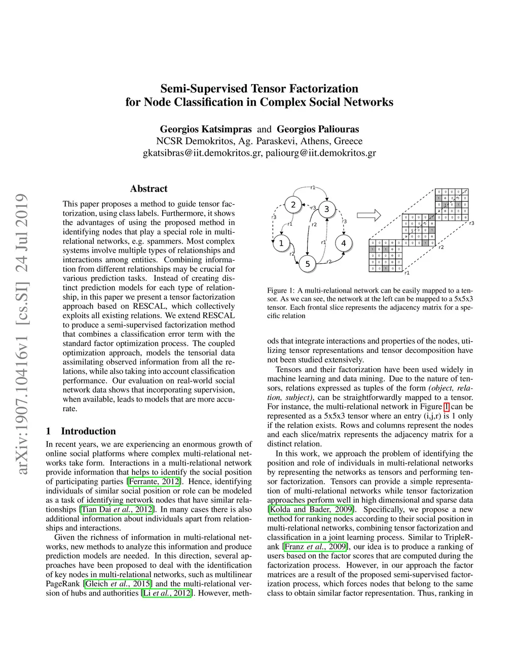 This paper proposes a method to guide tensor factorization, using class labels. Furthermore, it shows the advantages of using the proposed method in identifying nodes that play a special role in multi-relational networks, e.g. spammers. Most complex systems involve multiple types of relationships and interactions among entities. Combining information from different relationships may be crucial for various prediction tasks. Instead of creating distinct prediction models for each type of relationship, in this paper we present a tensor factorization approach based on RESCAL, which collectively exploits all existing relations. We extend RESCAL to produce a semi-supervised factorization method that combines a classification error term with the standard factor optimization process. The coupled optimization approach, models the tensorial data assimilating observed information from all the relations, while also taking into account classification performance. Our evaluation on real-world social network data shows that incorporating supervision, when available, leads to models that are more accurate.