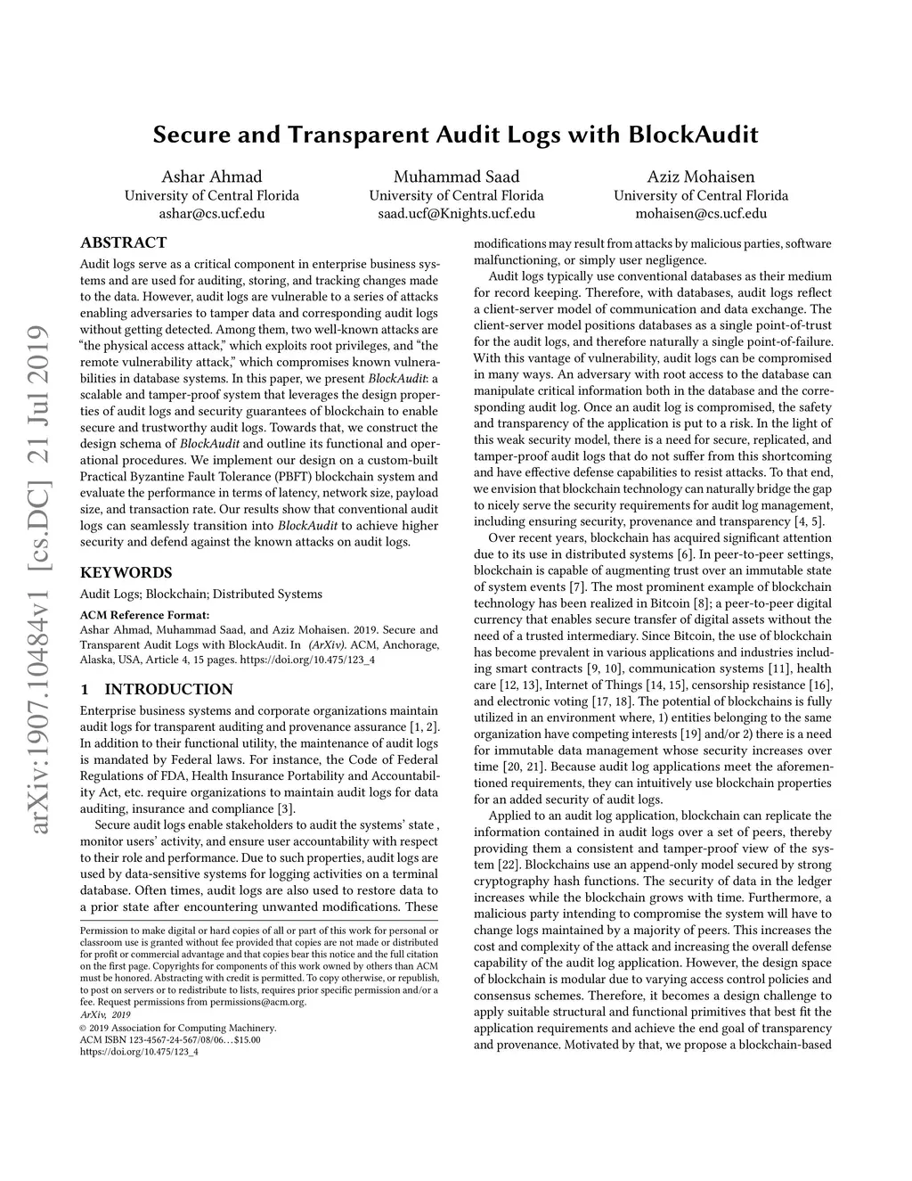 Audit logs serve as a critical component in enterprise business systems and are used for auditing, storing, and tracking changes made to the data. However, audit logs are vulnerable to a series of attacks enabling adversaries to tamper data and corresponding audit logs without getting detected. Among them, two well-known attacks are "the physical access attack," which exploits root privileges, and "the remote vulnerability attack," which compromises known vulnerabilities in database systems. In this paper, we present BlockAudit: a scalable and tamper-proof system that leverages the design properties of audit logs and security guarantees of blockchain to enable secure and trustworthy audit logs. Towards that, we construct the design schema of BlockAudit and outline its functional and operational procedures. We implement our design on a custom-built Practical Byzantine Fault Tolerance (PBFT) blockchain system and evaluate the performance in terms of latency, network size, payload size, and transaction rate. Our results show that conventional audit logs can seamlessly transition into BlockAudit to achieve higher security and defend against the known attacks on audit logs.