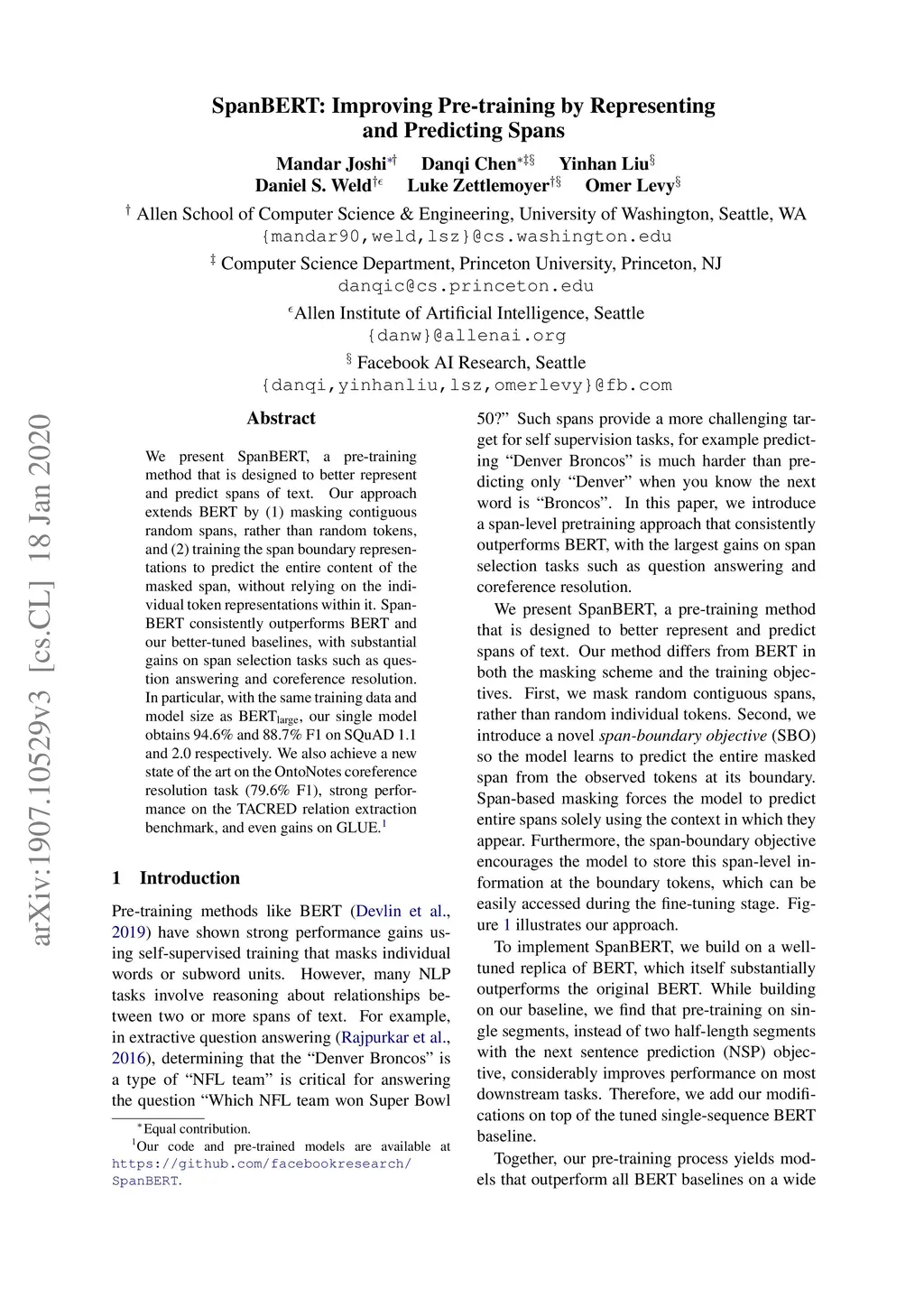SpanBERT: Improving Pre-training by Representing and Predicting Spans