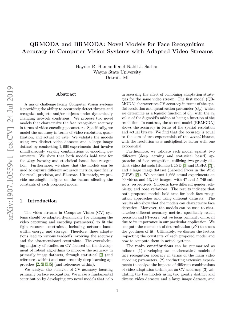 A major challenge facing Computer Vision systems is providing the ability to accurately detect threats and recognize subjects and/or objects under dynamically changing network conditions. We propose two novel models that characterize the face recognition accuracy in terms of video encoding parameters. Specifically, we model the accuracy in terms of video resolution, quantization, and actual bit rate. We validate the models using two distinct video datasets and a large image dataset by conducting 1, 668 experiments that involve simultaneously varying combinations of encoding parameters. We show that both models hold true for the deep learning and statistical based face recognition. Furthermore, we show that the models can be used to capture different accuracy metrics, specifically the recall, precision, and F1-score. Ultimately, we provide meaningful insights on the factors affecting the constants of each proposed model.