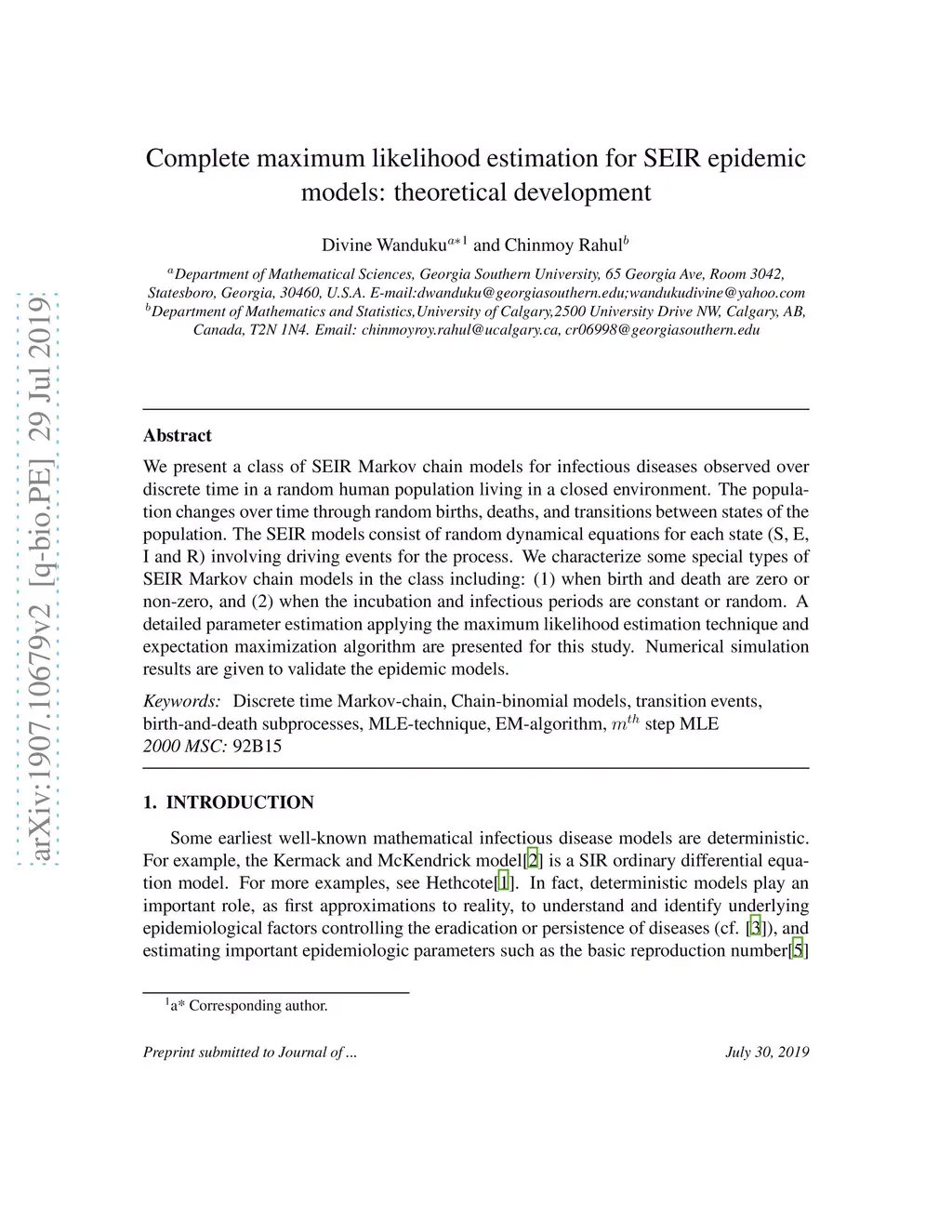 We present a class of SEIR Markov chain models for infectious diseases observed over discrete time in a random human population living in a closed environment. The population changes over time through random births, deaths, and transitions between states of the population. The SEIR models consist of random dynamical equations for each state (S, E, I and R) involving driving events for the process. We characterize some special types of SEIR Markov chain models in the class including: (1) when birth and death are zero or non-zero, and (2) when the incubation and infectious periods are constant or random. A detailed parameter estimation applying the maximum likelihood estimation technique and expectation maximization algorithm are presented for this study. Numerical simulation results are given to validate the epidemic models.