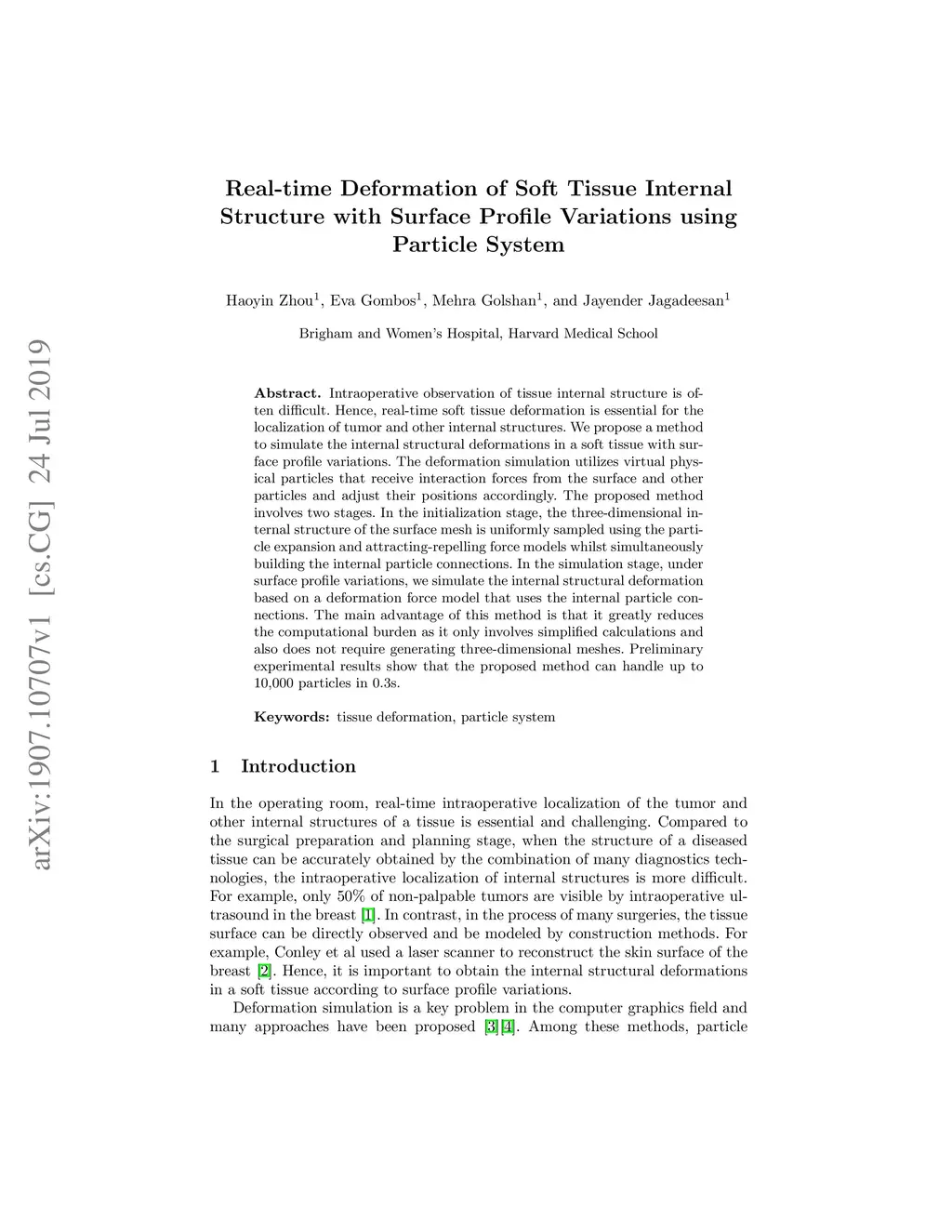 Intraoperative observation of tissue internal structure is often difficult. Hence, real-time soft tissue deformation is essential for the localization of tumor and other internal structures. We propose a method to simulate the internal structural deformations in a soft tissue with surface profile variations. The deformation simulation utilizes virtual physical particles that receive interaction forces from the surface and other particles and adjust their positions accordingly. The proposed method involves two stages. In the initialization stage, the three-dimensional internal structure of the surface mesh is uniformly sampled using the particle expansion and attracting-repelling force models whilst simultaneously building the internal particle connections. In the simulation stage, under surface profile variations, we simulate the internal structural deformation based on a deformation force model that uses the internal particle connections. The main advantage of this method is that it greatly reduces the computational burden as it only involves simplified calculations and also does not require generating three-dimensional meshes. Preliminary experimental results show that the proposed method can handle up to 10,000 particles in 0.3s.