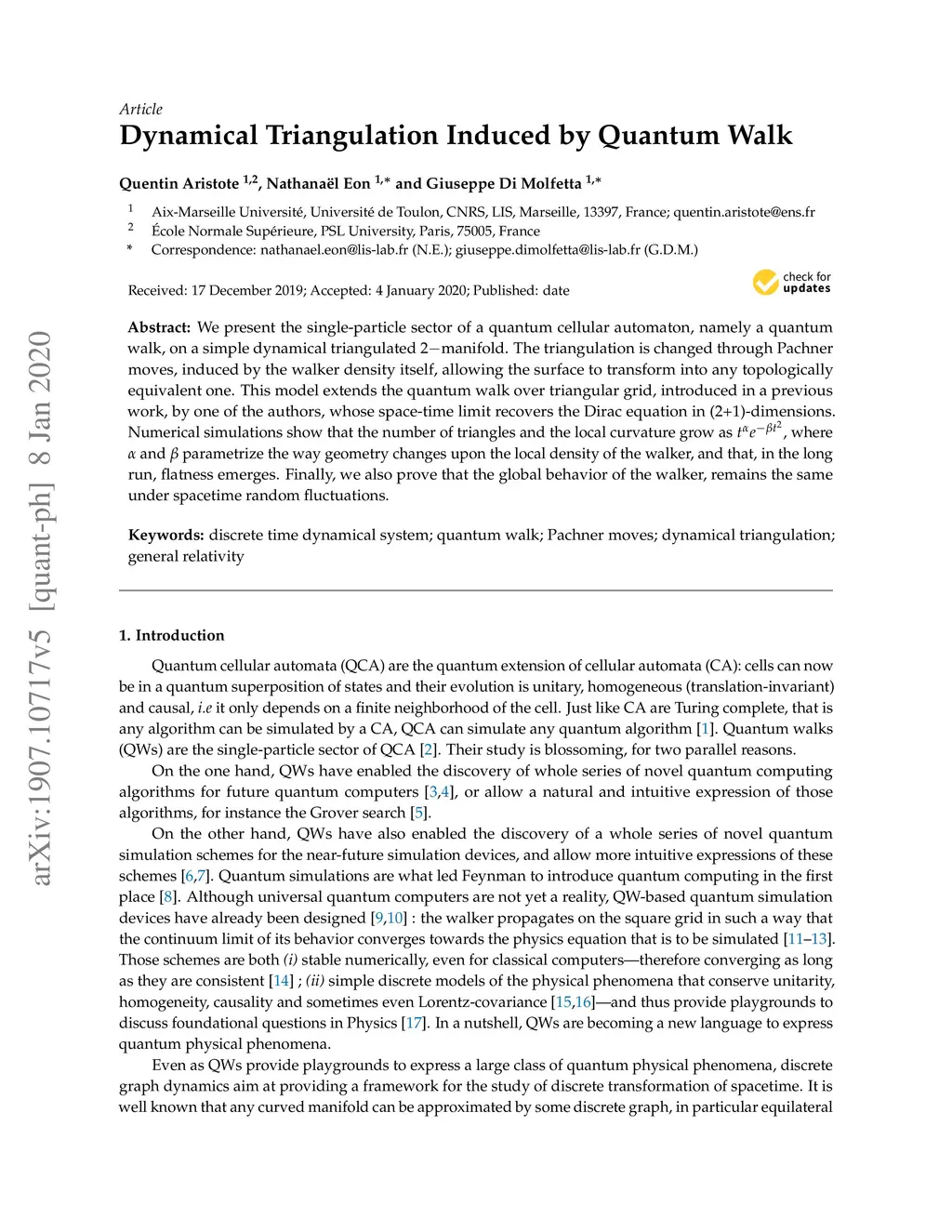 We present the single-particle sector of a quantum cellular automaton, namely a quantum walk, on a simple dynamical triangulated manifold. The triangulation is changed through Pachner moves, induced by the walker density itself, allowing the surface to transform into any topologically equivalent one. This model extends the quantum walk over triangular grid, introduced in a previous work, by one of the authors, whose space-time limit recovers the Dirac equation in (2+1)-dimensions. Numerical simulations show that the number of triangles and the local curvature grow as , where and parametrize the way geometry changes upon the local density of the walker, and that, in the long run, flatness emerges. Finally, we also prove that the global behavior of the walker, remains the same under spacetime random fluctuations.