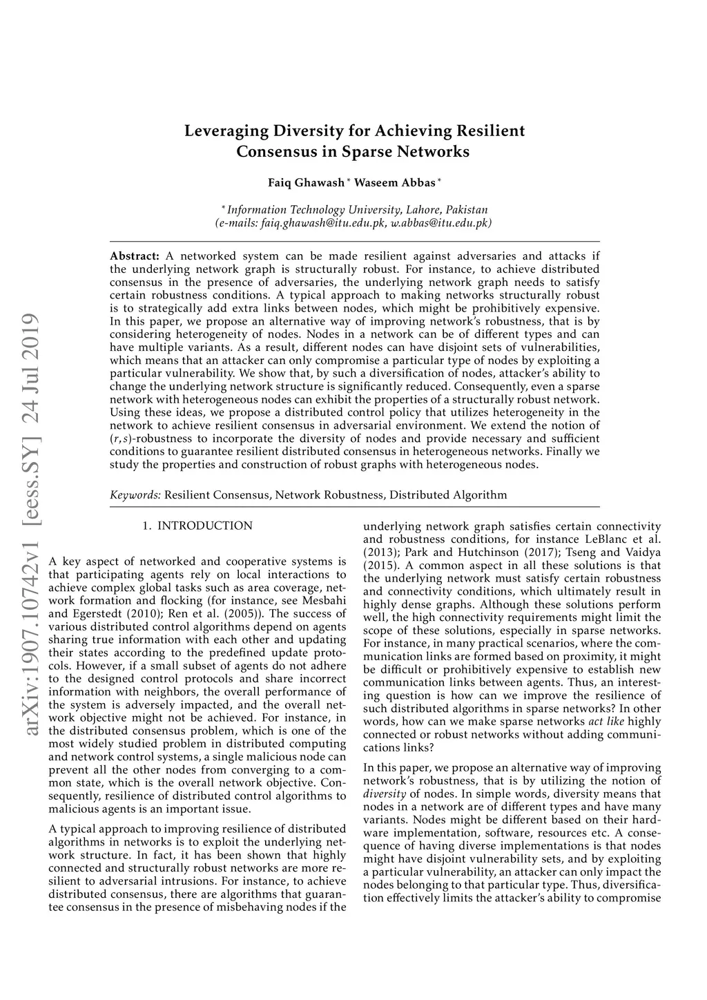 A networked system can be made resilient against adversaries and attacks if the underlying network graph is structurally robust. For instance, to achieve distributed consensus in the presence of adversaries, the underlying network graph needs to satisfy certain robustness conditions. A typical approach to making networks structurally robust is to strategically add extra links between nodes, which might be prohibitively expensive. In this paper, we propose an alternative way of improving network's robustness, that is by considering heterogeneity of nodes. Nodes in a network can be of different types and can have multiple variants. As a result, different nodes can have disjoint sets of vulnerabilities, which means that an attacker can only compromise a particular type of nodes by exploiting a particular vulnerability. We show that, by such a diversification of nodes, attacker's ability to change the underlying network structure is significantly reduced. Consequently, even a sparse network with heterogeneous nodes can exhibit the properties of a structurally robust network. Using these ideas, we propose a distributed control policy that utilizes heterogeneity in the network to achieve resilient consensus in adversarial environment. We extend the notion of -robustness to incorporate the diversity of nodes and provide necessary and sufficient conditions to guarantee resilient distributed consensus in heterogeneous networks. Finally we study the properties and construction of robust graphs with heterogeneous nodes.