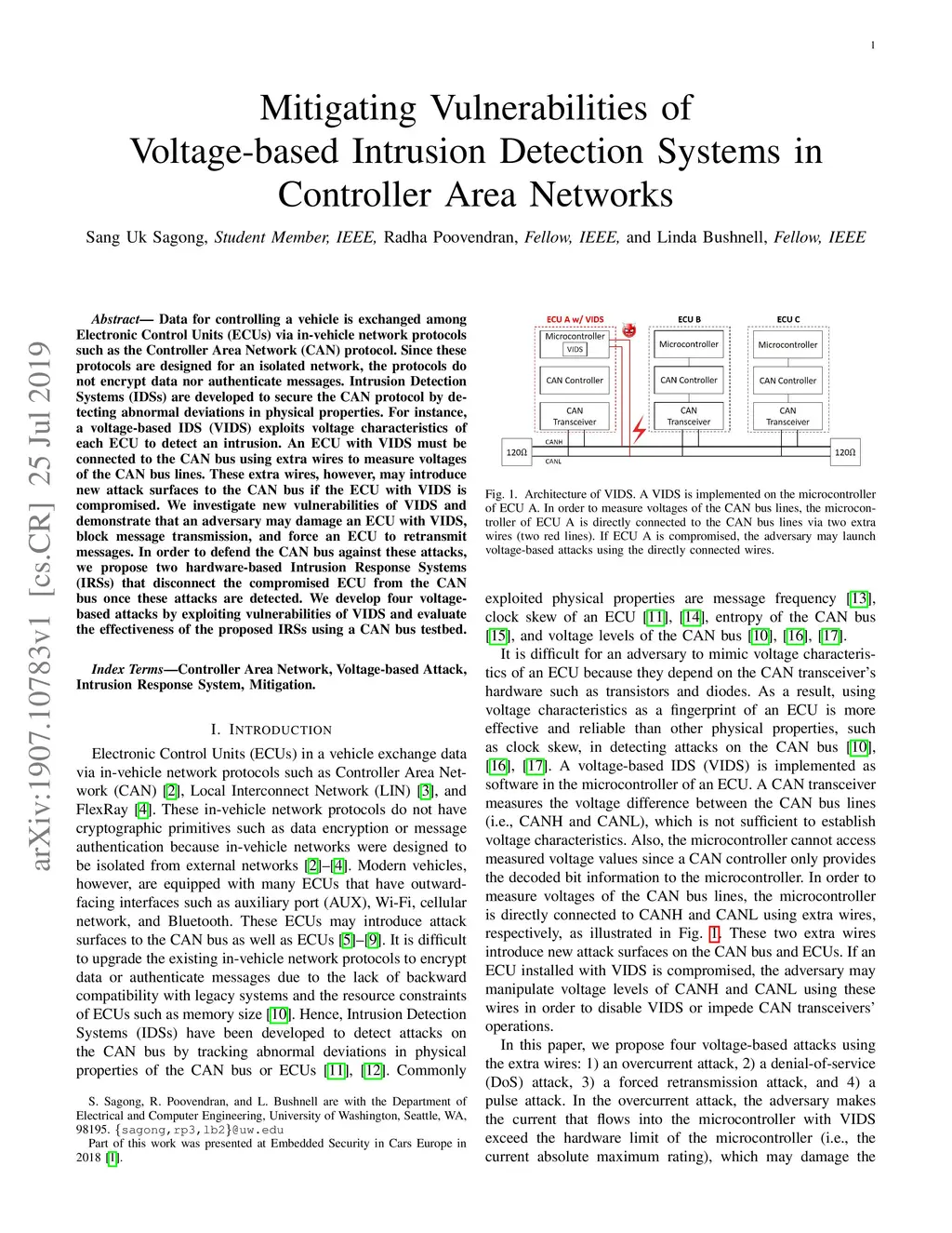 Data for controlling a vehicle is exchanged among Electronic Control Units (ECUs) via in-vehicle network protocols such as the Controller Area Network (CAN) protocol. Since these protocols are designed for an isolated network, the protocols do not encrypt data nor authenticate messages. Intrusion Detection Systems (IDSs) are developed to secure the CAN protocol by detecting abnormal deviations in physical properties. For instance, a voltage-based IDS (VIDS) exploits voltage characteristics of each ECU to detect an intrusion. An ECU with VIDS must be connected to the CAN bus using extra wires to measure voltages of the CAN bus lines. These extra wires, however, may introduce new attack surfaces to the CAN bus if the ECU with VIDS is compromised. We investigate new vulnerabilities of VIDS and demonstrate that an adversary may damage an ECU with VIDS, block message transmission, and force an ECU to retransmit messages. In order to defend the CAN bus against these attacks, we propose two hardware-based Intrusion Response Systems (IRSs) that disconnect the compromised ECU from the CAN bus once these attacks are detected. We develop four voltage-based attacks by exploiting vulnerabilities of VIDS and evaluate the effectiveness of the proposed IRSs using a CAN bus testbed.