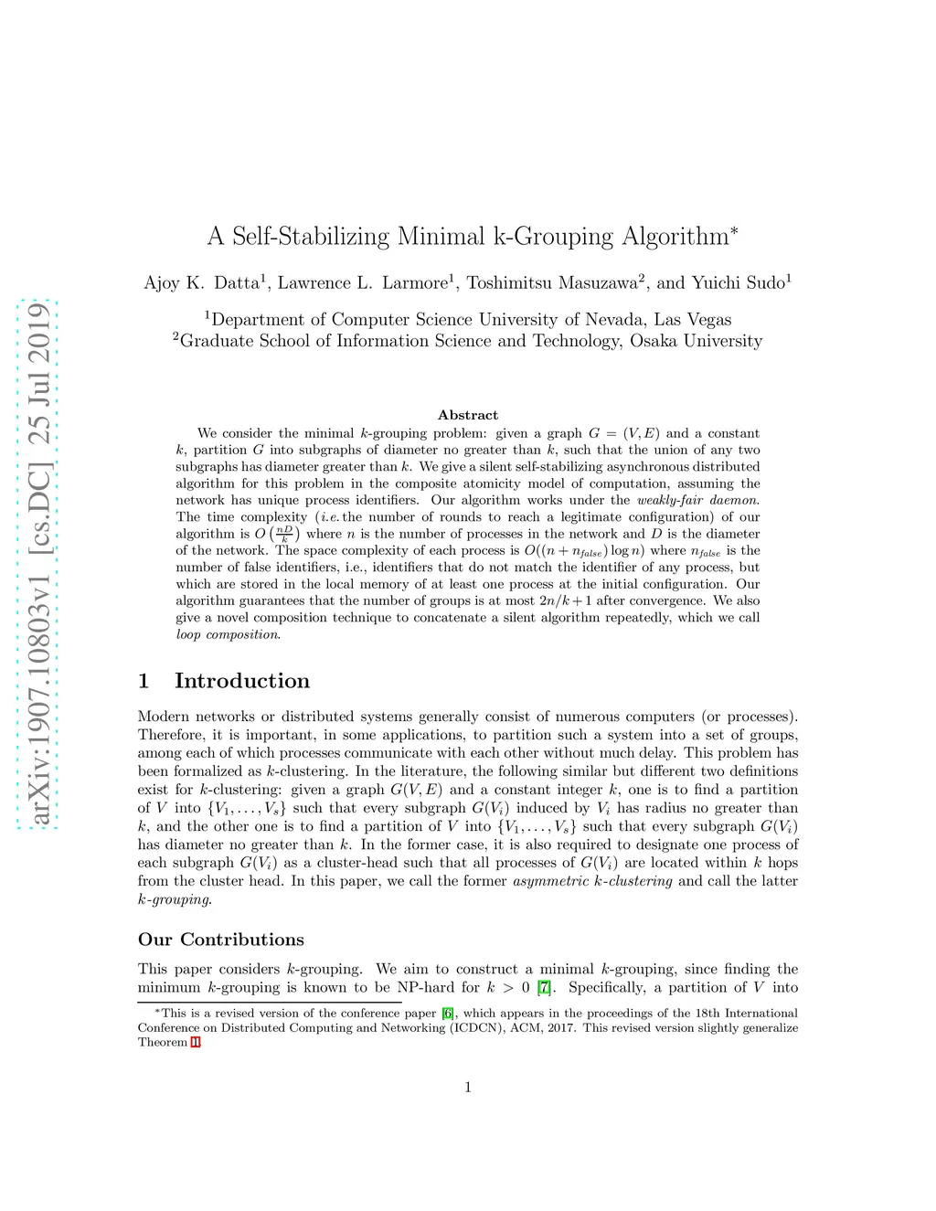 We consider the minimal k-grouping problem: given a graph G=(V,E) and a constant k, partition G into subgraphs of diameter no greater than k, such that the union of any two subgraphs has diameter greater than k. We give a silent self-stabilizing asynchronous distributed algorithm for this problem in the composite atomicity model of computation, assuming the network has unique process identifiers. Our algorithm works under the weakly-fair daemon. The time complexity (i.e., the number of rounds to reach a legitimate configuration) of our algorithm is O(nD/k) where n is the number of processes in the network and \diam is the diameter of the network. The space complexity of each process is O((n +n_{false})log n) where n_{false} is the number of false identifiers, i.e., identifiers that do not match the identifier of any process, but which are stored in the local memory of at least one process at the initial configuration. Our algorithm guarantees that the number of groups is at most after convergence. We also give a novel composition technique to concatenate a silent algorithm repeatedly, which we call loop composition.