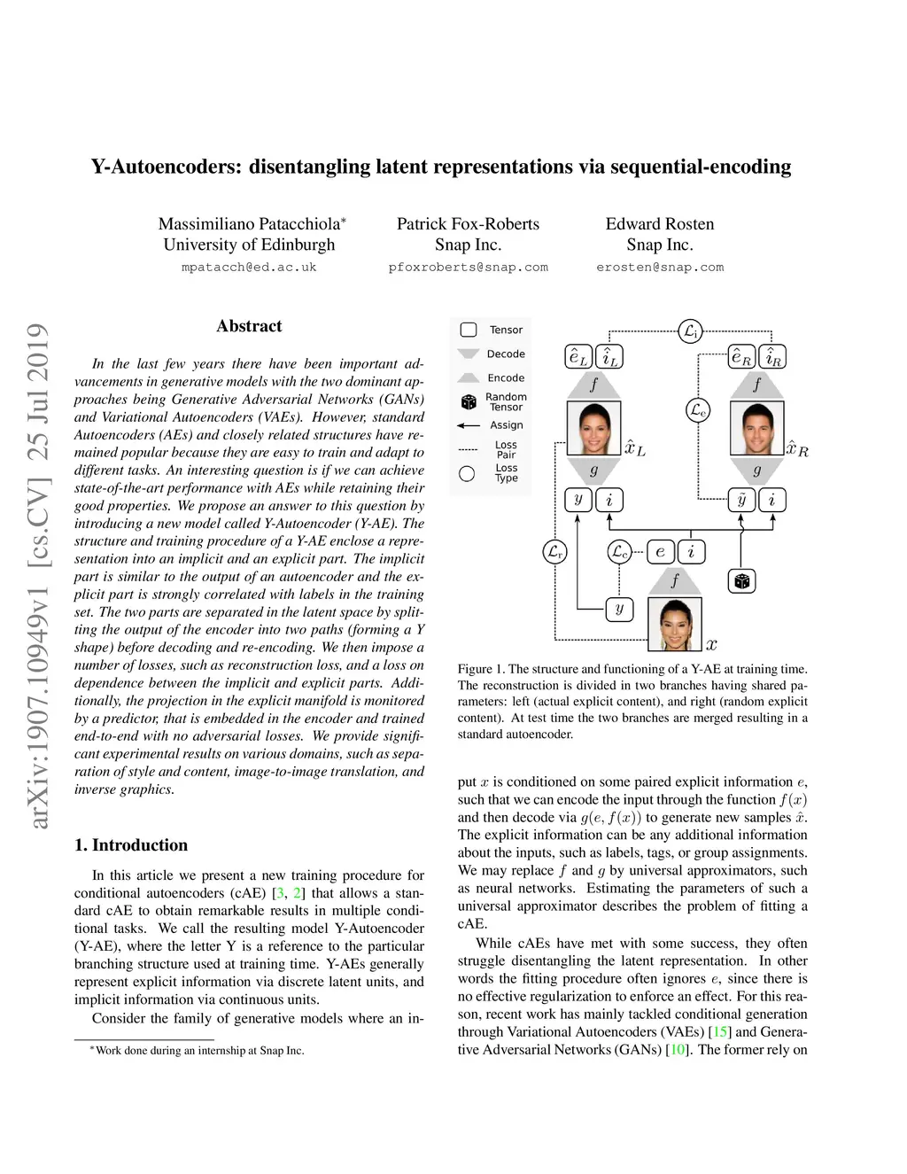 In the last few years there have been important advancements in generative models with the two dominant approaches being Generative Adversarial Networks (GANs) and Variational Autoencoders (VAEs). However, standard Autoencoders (AEs) and closely related structures have remained popular because they are easy to train and adapt to different tasks. An interesting question is if we can achieve state-of-the-art performance with AEs while retaining their good properties. We propose an answer to this question by introducing a new model called Y-Autoencoder (Y-AE). The structure and training procedure of a Y-AE enclose a representation into an implicit and an explicit part. The implicit part is similar to the output of an autoencoder and the explicit part is strongly correlated with labels in the training set. The two parts are separated in the latent space by splitting the output of the encoder into two paths (forming a Y shape) before decoding and re-encoding. We then impose a number of losses, such as reconstruction loss, and a loss on dependence between the implicit and explicit parts. Additionally, the projection in the explicit manifold is monitored by a predictor, that is embedded in the encoder and trained end-to-end with no adversarial losses. We provide significant experimental results on various domains, such as separation of style and content, image-to-image translation, and inverse graphics.
