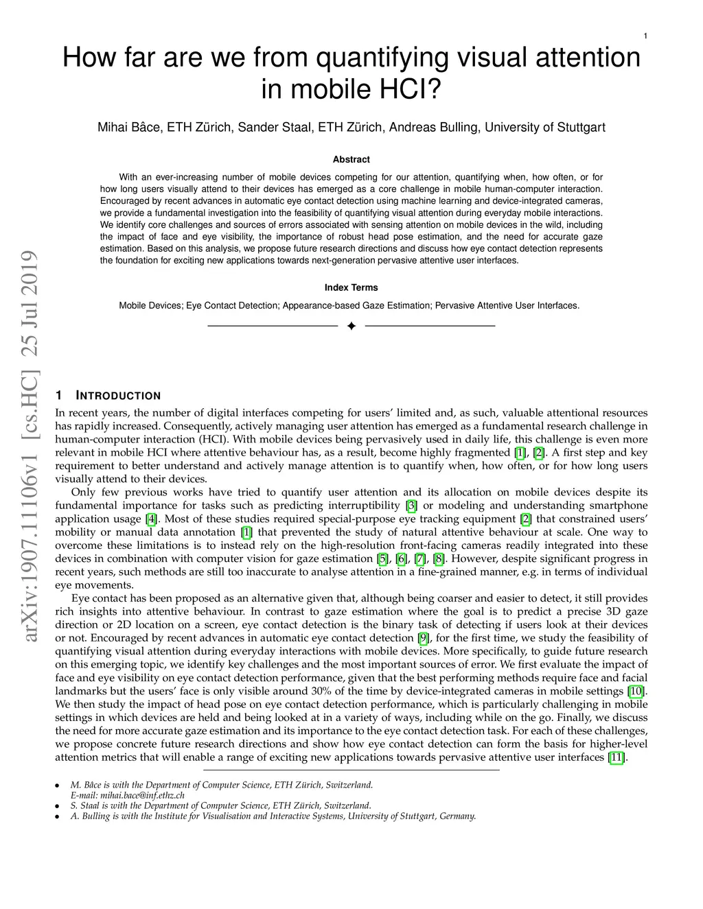 With an ever-increasing number of mobile devices competing for our attention, quantifying when, how often, or for how long users visually attend to their devices has emerged as a core challenge in mobile human-computer interaction. Encouraged by recent advances in automatic eye contact detection using machine learning and device-integrated cameras, we provide a fundamental investigation into the feasibility of quantifying visual attention during everyday mobile interactions. We identify core challenges and sources of errors associated with sensing attention on mobile devices in the wild, including the impact of face and eye visibility, the importance of robust head pose estimation, and the need for accurate gaze estimation. Based on this analysis, we propose future research directions and discuss how eye contact detection represents the foundation for exciting new applications towards next-generation pervasive attentive user interfaces.