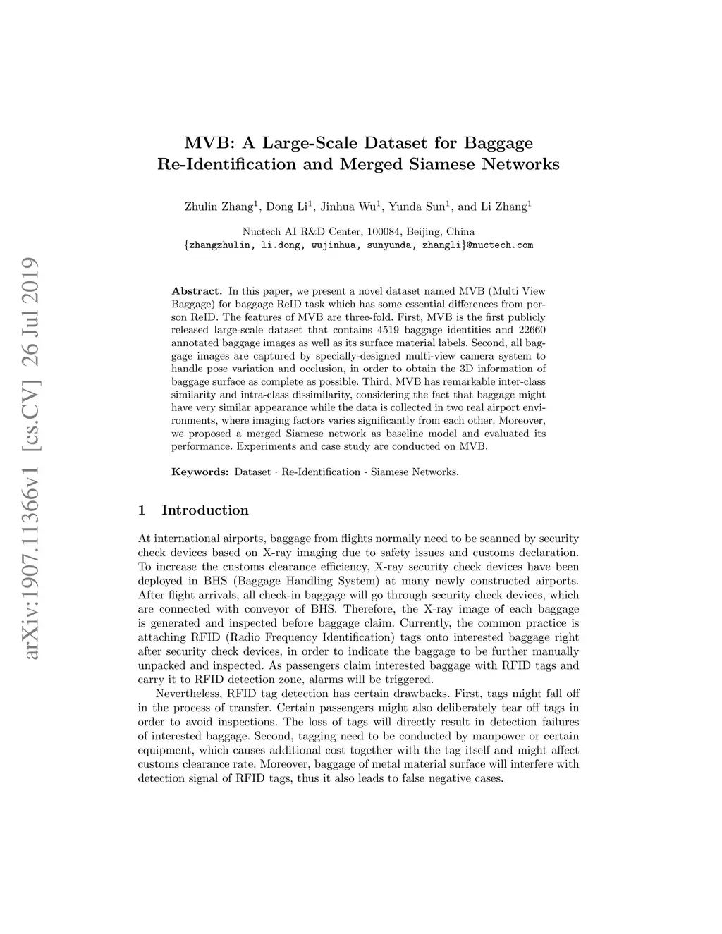 In this paper, we present a novel dataset named MVB (Multi View Baggage) for baggage ReID task which has some essential differences from person ReID. The features of MVB are three-fold. First, MVB is the first publicly released large-scale dataset that contains 4519 baggage identities and 22660 annotated baggage images as well as its surface material labels. Second, all baggage images are captured by specially-designed multi-view camera system to handle pose variation and occlusion, in order to obtain the 3D information of baggage surface as complete as possible. Third, MVB has remarkable inter-class similarity and intra-class dissimilarity, considering the fact that baggage might have very similar appearance while the data is collected in two real airport environments, where imaging factors varies significantly from each other. Moreover, we proposed a merged Siamese network as baseline model and evaluated its performance. Experiments and case study are conducted on MVB.
