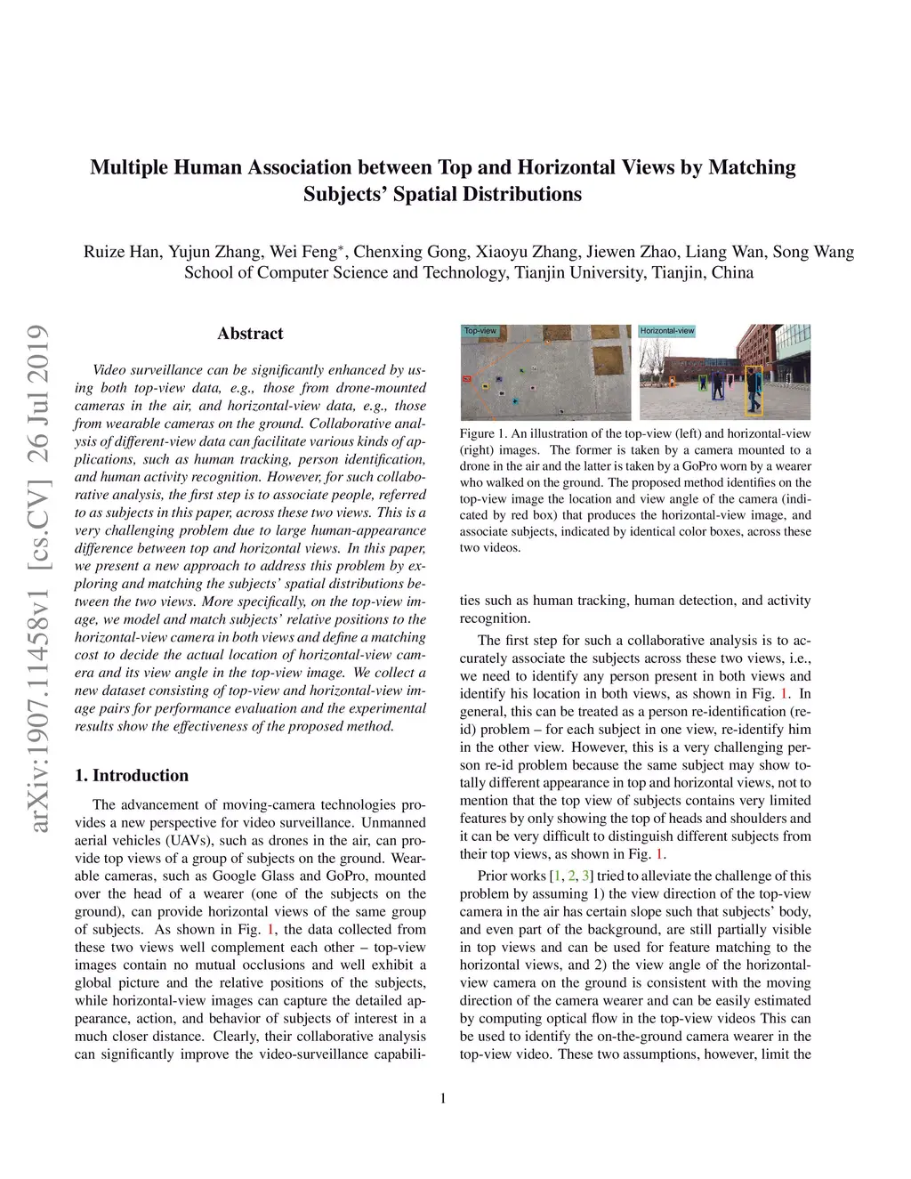 Video surveillance can be significantly enhanced by using both top-view data, e.g., those from drone-mounted cameras in the air, and horizontal-view data, e.g., those from wearable cameras on the ground. Collaborative analysis of different-view data can facilitate various kinds of applications, such as human tracking, person identification, and human activity recognition. However, for such collaborative analysis, the first step is to associate people, referred to as subjects in this paper, across these two views. This is a very challenging problem due to large human-appearance difference between top and horizontal views. In this paper, we present a new approach to address this problem by exploring and matching the subjects' spatial distributions between the two views. More specifically, on the top-view image, we model and match subjects' relative positions to the horizontal-view camera in both views and define a matching cost to decide the actual location of horizontal-view camera and its view angle in the top-view image. We collect a new dataset consisting of top-view and horizontal-view image pairs for performance evaluation and the experimental results show the effectiveness of the proposed method.