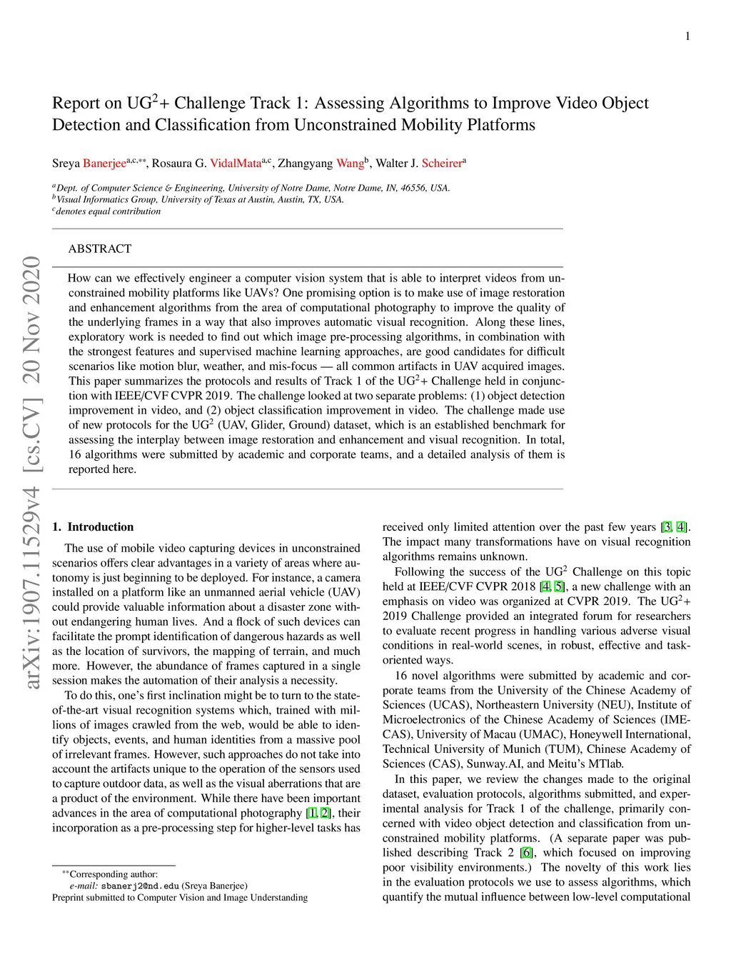 How can we effectively engineer a computer vision system that is able to interpret videos from unconstrained mobility platforms like UAVs? One promising option is to make use of image restoration and enhancement algorithms from the area of computational photography to improve the quality of the underlying frames in a way that also improves automatic visual recognition. Along these lines, exploratory work is needed to find out which image pre-processing algorithms, in combination with the strongest features and supervised machine learning approaches, are good candidates for difficult scenarios like motion blur, weather, and mis-focus -- all common artifacts in UAV acquired images. This paper summarizes the protocols and results of Track 1 of the UG^2+ Challenge held in conjunction with IEEE/CVF CVPR 2019. The challenge looked at two separate problems: (1) object detection improvement in video, and (2) object classification improvement in video. The challenge made use of the UG^2 (UAV, Glider, Ground) dataset, which is an established benchmark for assessing the interplay between image restoration and enhancement and visual recognition. 16 algorithms were submitted by academic and corporate teams, and a detailed analysis of how they performed on each challenge problem is reported here.