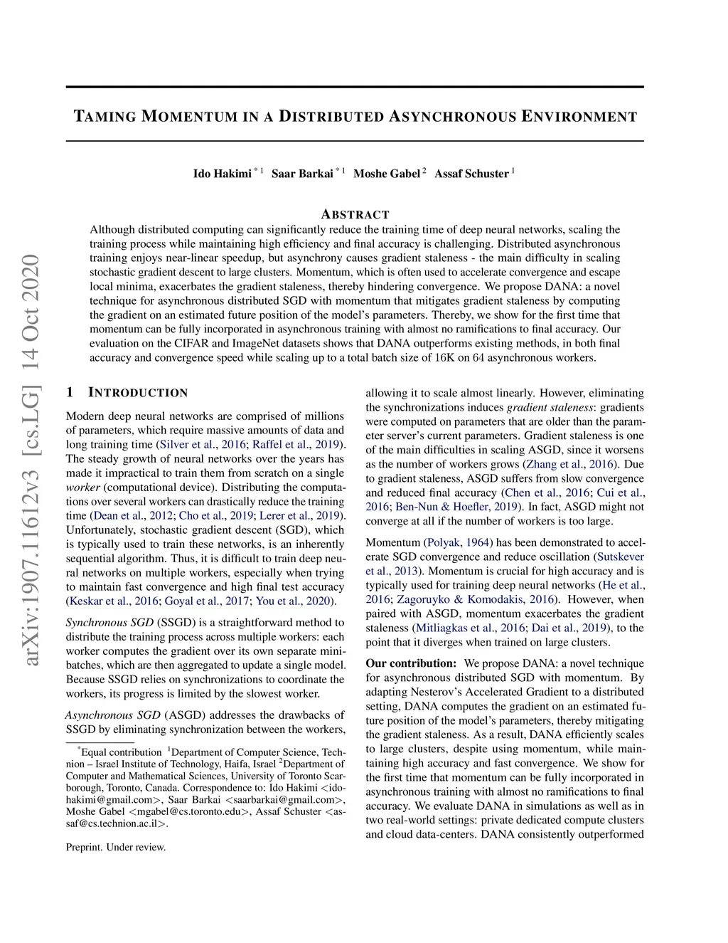 Although distributed computing can significantly reduce the training time of deep neural networks, scaling the training process while maintaining high efficiency and final accuracy is challenging. Distributed asynchronous training enjoys near-linear speedup, but asynchrony causes gradient staleness - the main difficulty in scaling stochastic gradient descent to large clusters. Momentum, which is often used to accelerate convergence and escape local minima, exacerbates the gradient staleness, thereby hindering convergence. We propose DANA: a novel technique for asynchronous distributed SGD with momentum that mitigates gradient staleness by computing the gradient on an estimated future position of the model's parameters. Thereby, we show for the first time that momentum can be fully incorporated in asynchronous training with almost no ramifications to final accuracy. Our evaluation on the CIFAR and ImageNet datasets shows that DANA outperforms existing methods, in both final accuracy and convergence speed while scaling up to a total batch size of 16K on 64 asynchronous workers.