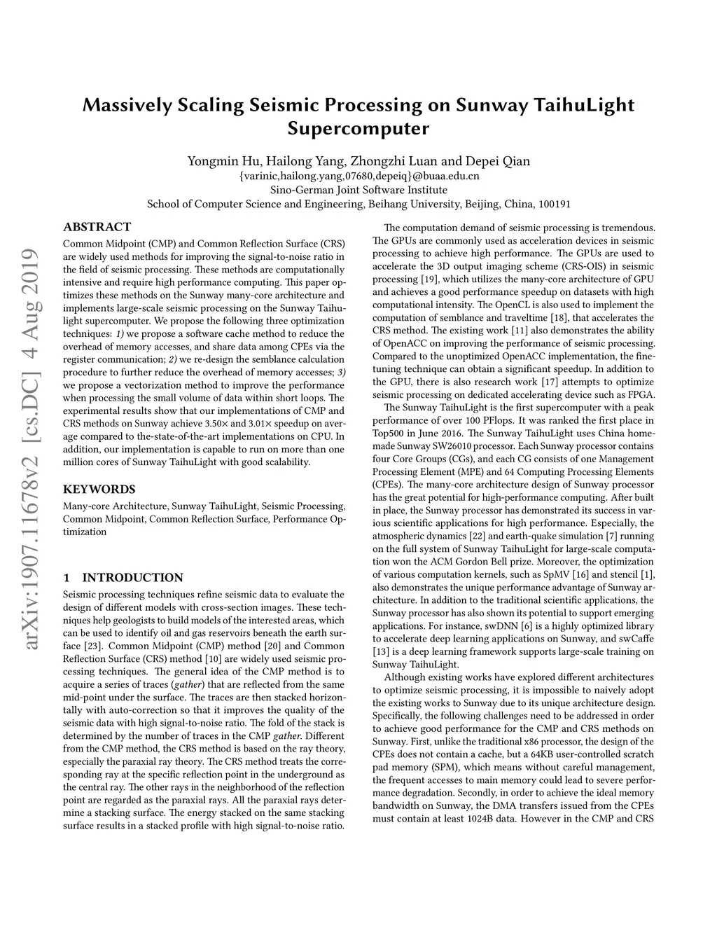 Common Midpoint (CMP) and Common Reflection Surface (CRS) are widely used methods for improving the signal-to-noise ratio in the field of seismic processing. These methods are computationally intensive and require high performance computing. This paper optimizes these methods on the Sunway many-core architecture and implements large-scale seismic processing on the Sunway Taihulight supercomputer. We propose the following three optimization techniques: 1) we propose a software cache method to reduce the overhead of memory accesses, and share data among CPEs via the register communication; 2) we re-design the semblance calculation procedure to further reduce the overhead of memory accesses; 3) we propose a vectorization method to improve the performance when processing the small volume of data within short loops. The experimental results show that our implementations of CMP and CRS methods on Sunway achieve 3.50x and 3.01x speedup on average compared to the-state-of-the-art implementations on CPU. In addition, our implementation is capable to run on more than one million cores of Sunway TaihuLight with good scalability.