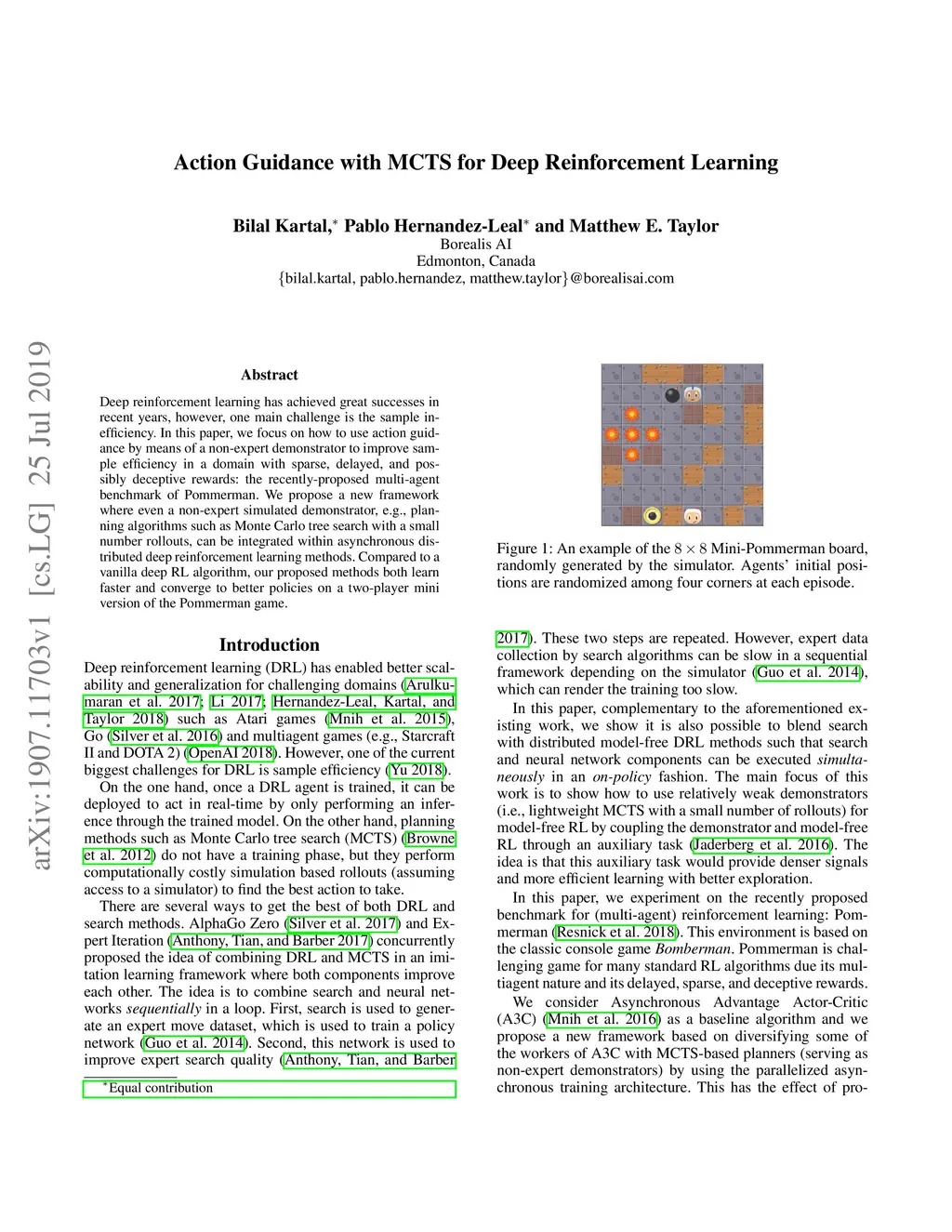 Deep reinforcement learning has achieved great successes in recent years, however, one main challenge is the sample inefficiency. In this paper, we focus on how to use action guidance by means of a non-expert demonstrator to improve sample efficiency in a domain with sparse, delayed, and possibly deceptive rewards: the recently-proposed multi-agent benchmark of Pommerman. We propose a new framework where even a non-expert simulated demonstrator, e.g., planning algorithms such as Monte Carlo tree search with a small number rollouts, can be integrated within asynchronous distributed deep reinforcement learning methods. Compared to a vanilla deep RL algorithm, our proposed methods both learn faster and converge to better policies on a two-player mini version of the Pommerman game.